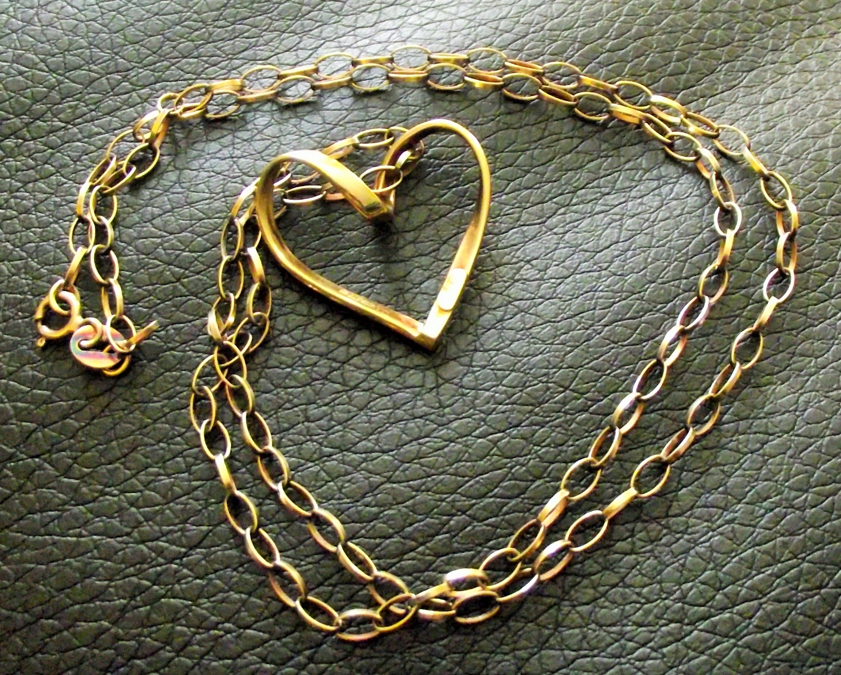 A 9ct gold necklace composed of a yellow 9ct gold chain and a 9ct gold heart-shaped pendant. The chain features elongated, flattened oval links and fastens with a spring-ring clasp. The pendant is a substantial, polished open heart design. 3.5g approx