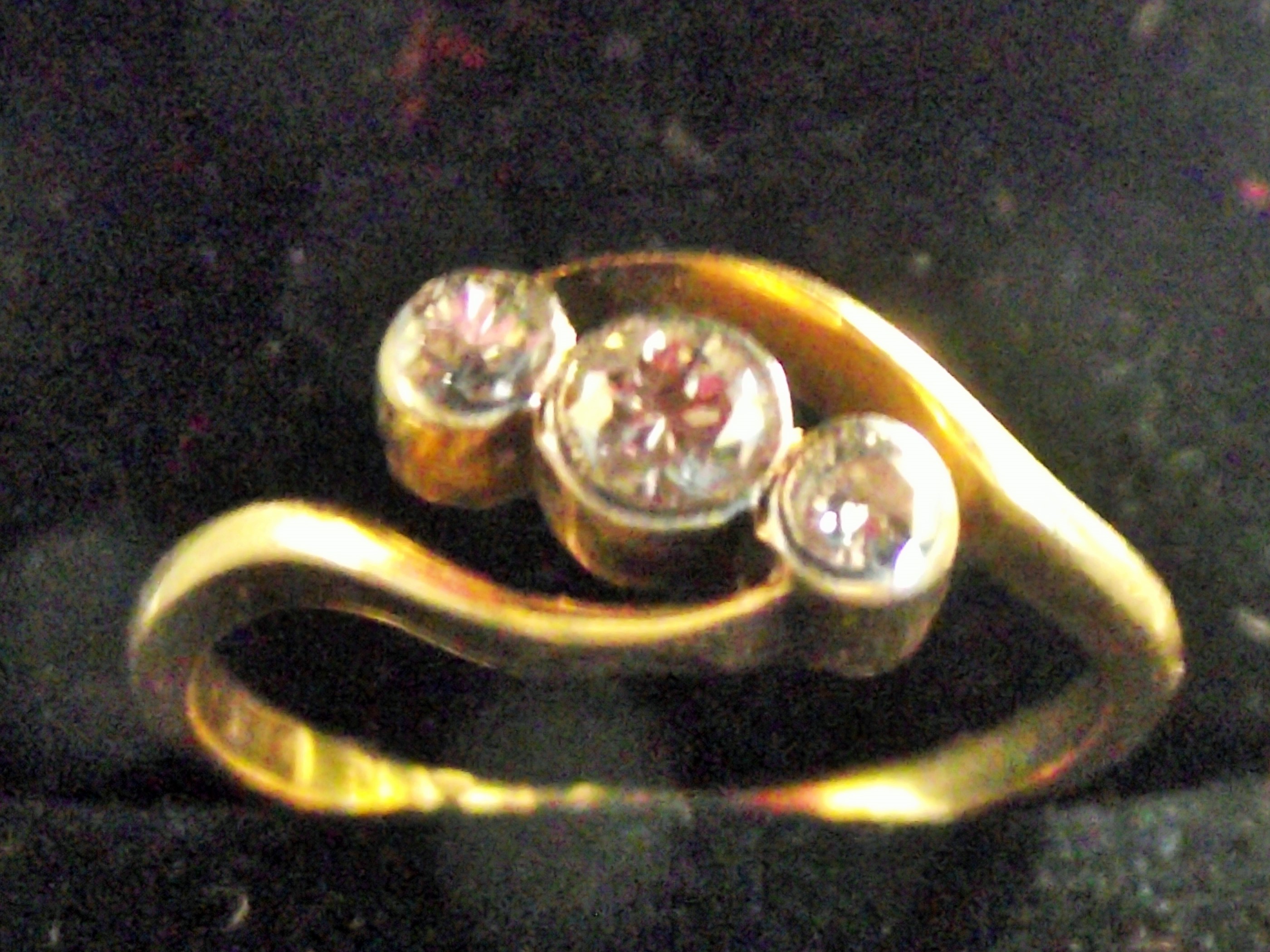 An Edwardian style three stone 18ct & Platinum Diamond crossover ring, crafted from a yellow-toned metal. The bypass or crossover style shank cradles three round, faceted Diamond stones, each set in an individual bezel or semi-bezel setting. 0.2 ct approx 2.7g approx