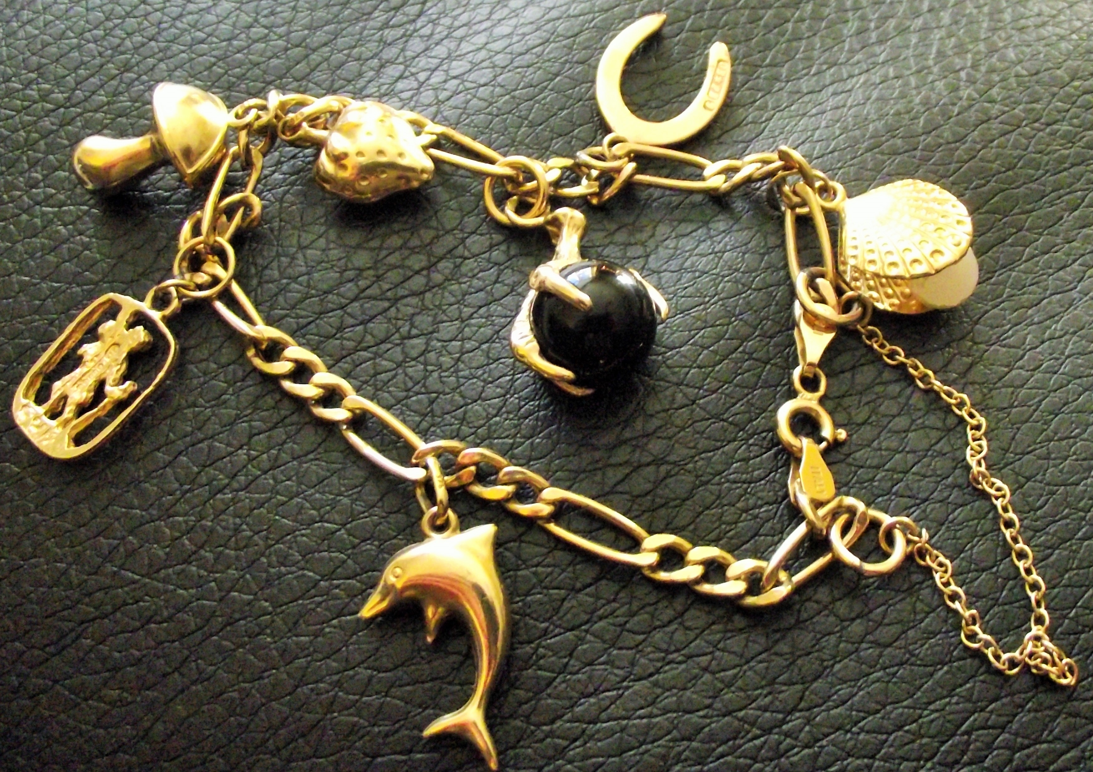 A fully marked 9ct gold charm bracelet featuring a Figaro-link style chain and an attached safety chain. The bracelet is adorned with multiple charms including a mushroom, a textured strawberry, a stylized dolphin, a crescent moon or horseshoe shape, a rectangular openwork charm depicting a human figure, a black spherical bead set in a claw-like mount, and a scallop shell-shaped charm containing a white, possibly mother-of-pearl 9.8g approx