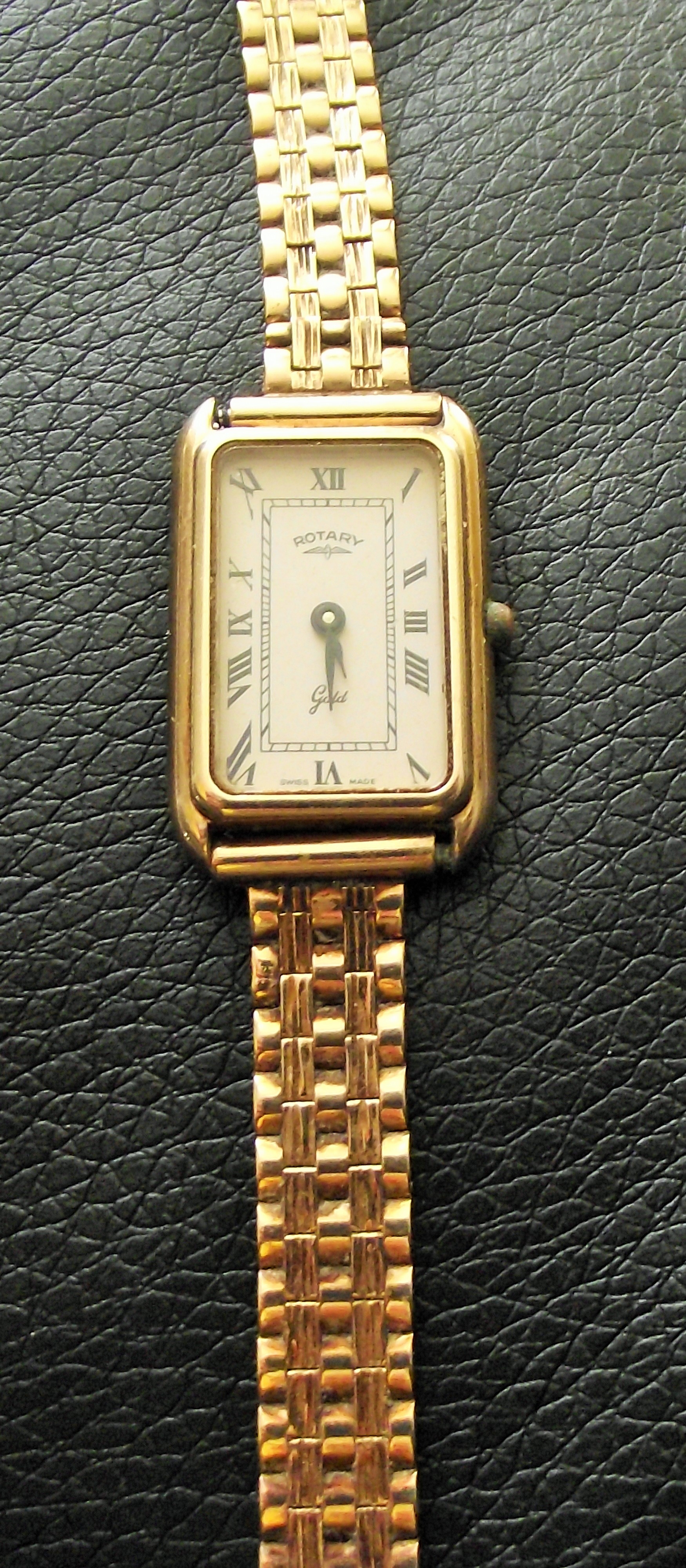 A Rotary 9ct gold rectangular-cased wristwatch on 9ct gold bracelet .Battery operated The watch features a rectangular case and the multi-link bracelet. The white dial is adorned with black Roman numeral hour markers, complemented by a thin rectangular track indicating minute markers. The dial prominently displays “ROTARY” with its winged logo at the 12 o’clock position, a cursive script that appears to read “Golds” below the central hands, and “SWISS MADE” at the 6 o’clock position. A simple crown is located on the right side of the case.26.5g approx