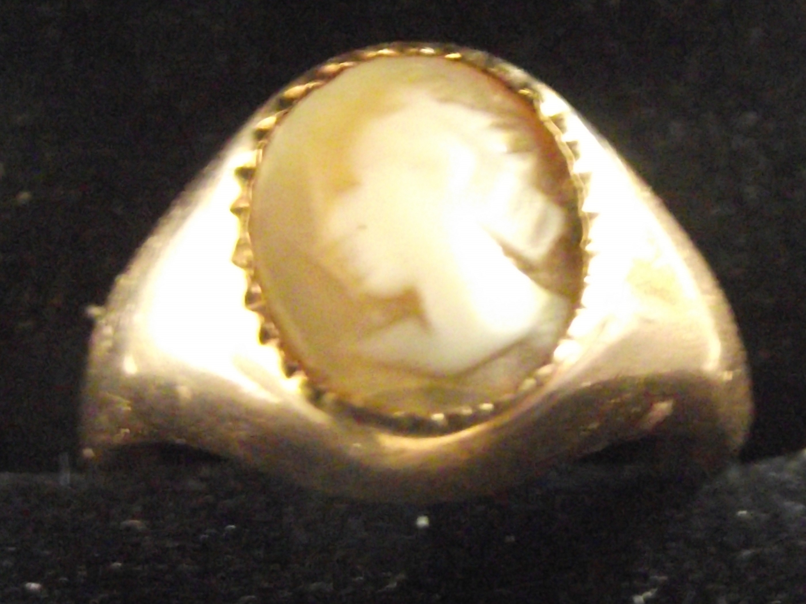 Ladies antique 9ct cameo ring circa 1880 London 2.7g approx The cameo, appearing to be carved from a light-colored shell, depicts a classical-style female profile portrait facing right, utilizing two distinct layers for contrast. The cameo is set within a bezel with a decorative, possibly serrated or milgrain edge. The ring’s shoulders are broad and tapered.