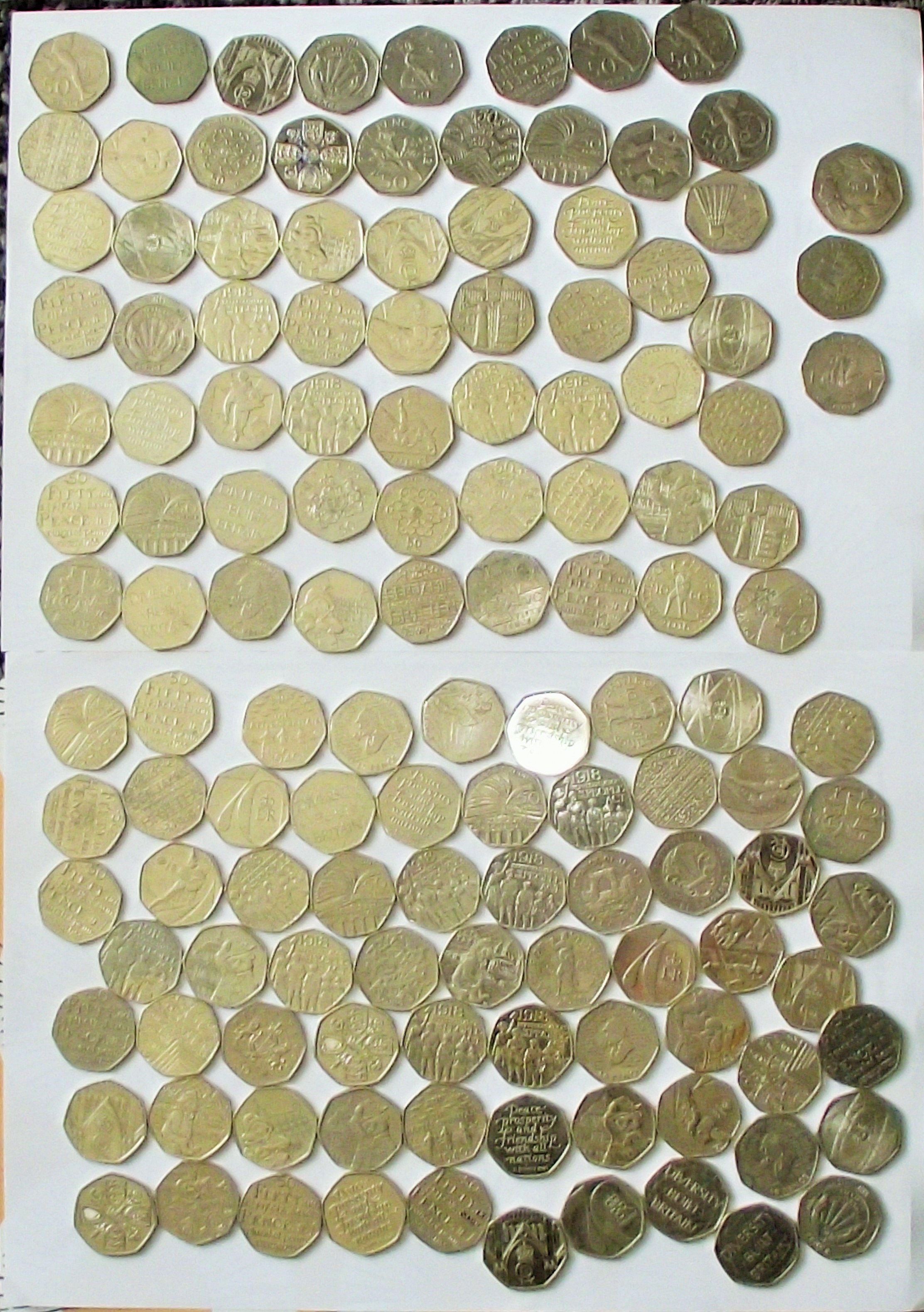 A collection of approximately 128 modern British fifty pence (50p) coins, mostly heptagonal in shape and composed of a silver-toned base metal. These commemorative coins feature a diverse range of designs, including numerous examples from the London 2012 Olympic and Paralympic Games series (depicting sports such as swimming, archery, javelin, cycling, taekwondo, badminton, and weightlifting). Other themes include historical events like Women’s Suffrage (with the date “1918” visible on some), and cultural figures and characters such as Beatrix Potter’s Peter Rabbit, Flopsy Bunny, Squirrel Nutkin, Paddington Bear, Sherlock Holmes, and Benjamin Britten. Visible inscriptions include “FIFTY PENCE”, “50”, “QUEEN ELIZABETH II” (on the obverses), “PEACE PROSPERITY AND FRIENDSHIP WITH ALL NATIONS”, and “DIVERSITY BUILDS BRITAIN”, with various dates primarily ranging from “2010” to “2019”.+ East Caribbean states 1 dollar coin , Bailiwick Jersey fifty pence and one old 50 pence piece