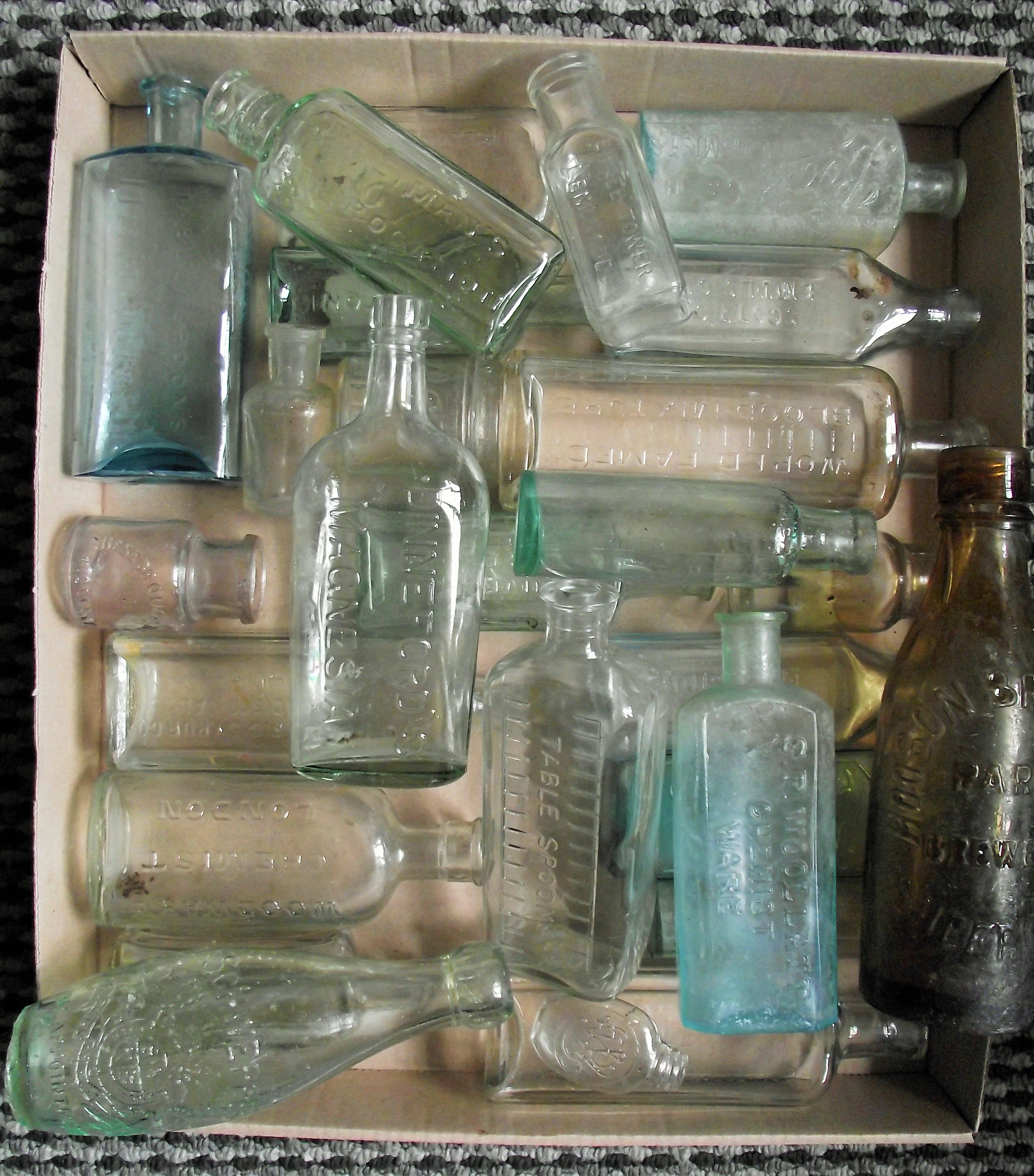 Collection of old bottles some chemist related woodward chemist london boots chemist ellmands embrocation dinefords magnesia foster clake ltd Eifell tower lemonade etc + old beer bottle and Schweppes bottle