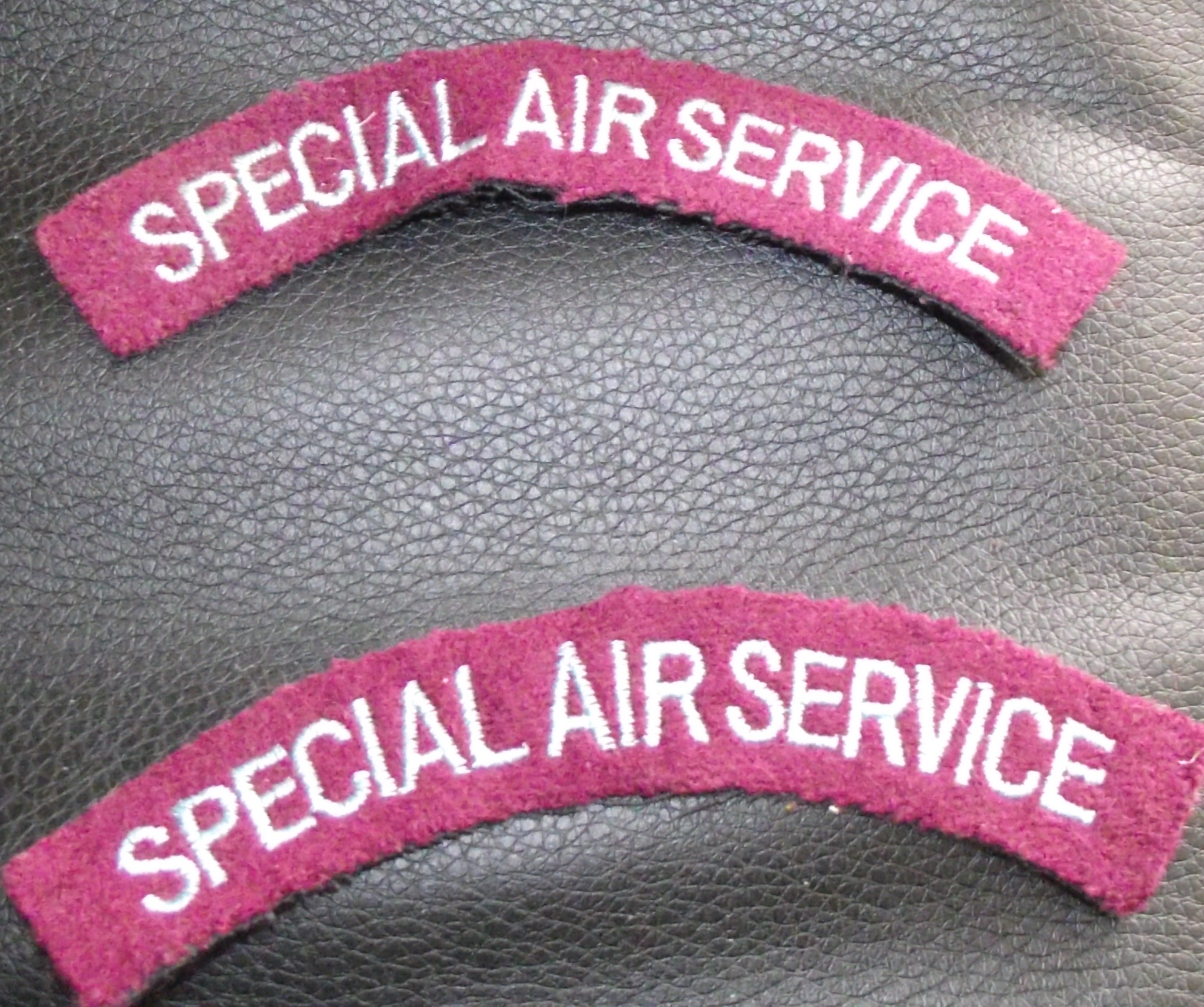 Pair of Special air Service shoulder titles pale blue embroidered on maroon felt example worn on Battledress
