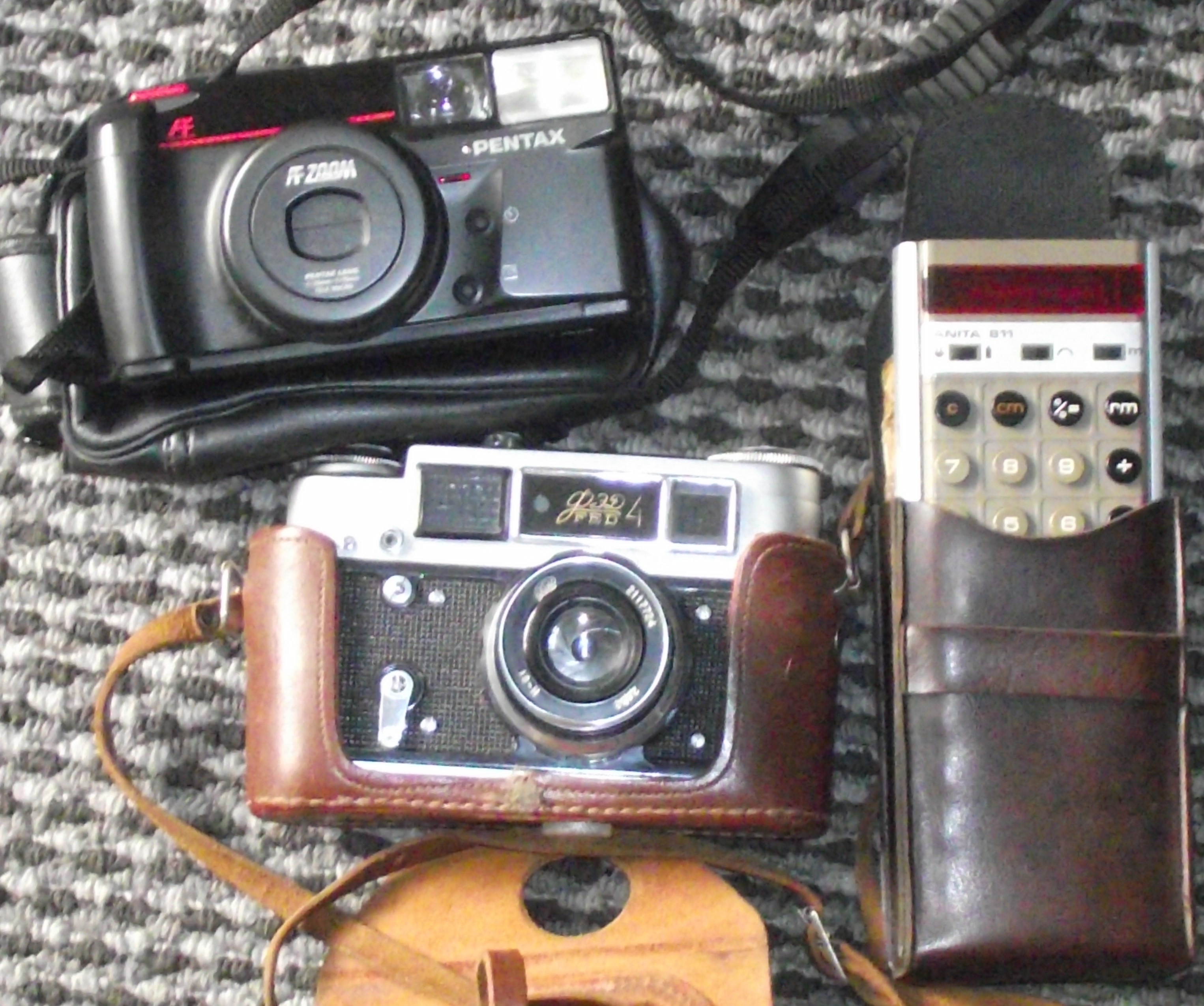 A group of three electronic devices. The first, a Soviet FED 4 film camera, though visually marked ‘ЗОРКИЙ 4’ (Zorki 4) on the top plate, features a silver-toned metal body with black textured panels, bearing a partial serial number ‘2117724’ and ‘MADE IN USSR’. It is presented in a worn brown leather ‘ever-ready’ case with a matching strap. The second item is a black, modern-style Pentax AF Zoom point-and-shoot camera, identified by ‘PENTAX’ and ‘AF ZOOM’ branding with ‘PENTAX LENS’ and ‘FILM MACRO’ text on the lens barrel, resting within a black leatherette soft case and having an attached black strap. The third item is a portable electronic calculator, labeled ‘MITA 811’ with a red LED-style display and cream and black keys for numbers and functions like ‘c, ‘ ‘cm, ‘ ‘%-, ‘ and ‘rm, ‘ housed in a dark brown rigid leatherette case.