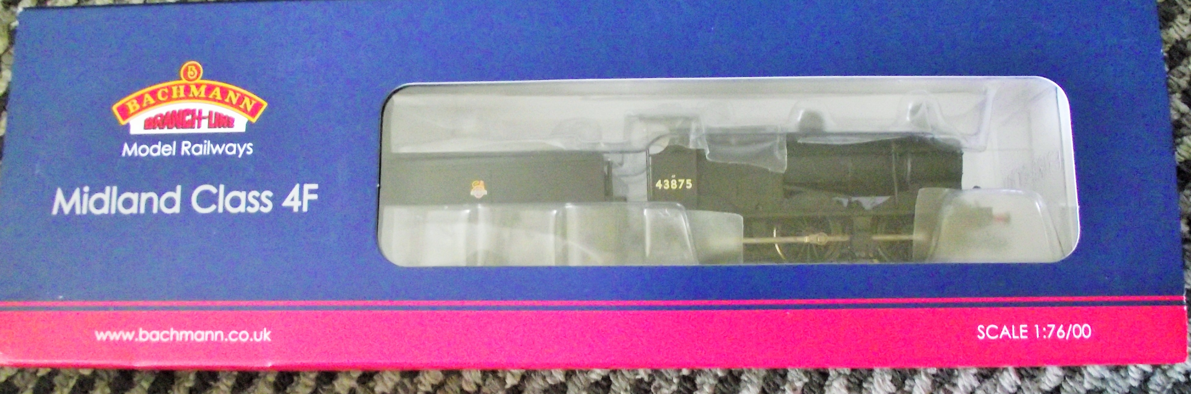 A Bachmann Branch-Line ‘Midland Class 4F’ model railway locomotive, presented in a dark green livery and bearing the number ‘43875’ along with a small crest on its tender. The model is enclosed within its original blue and red cardboard box, which features a clear plastic window revealing the item. The outer box is marked with ‘BACHMANN Branch-Line Model Railways’, ‘Midland Class 4F’, ‘SCALE 1:76/00’, and ‘www.bachmann.co.uk’.