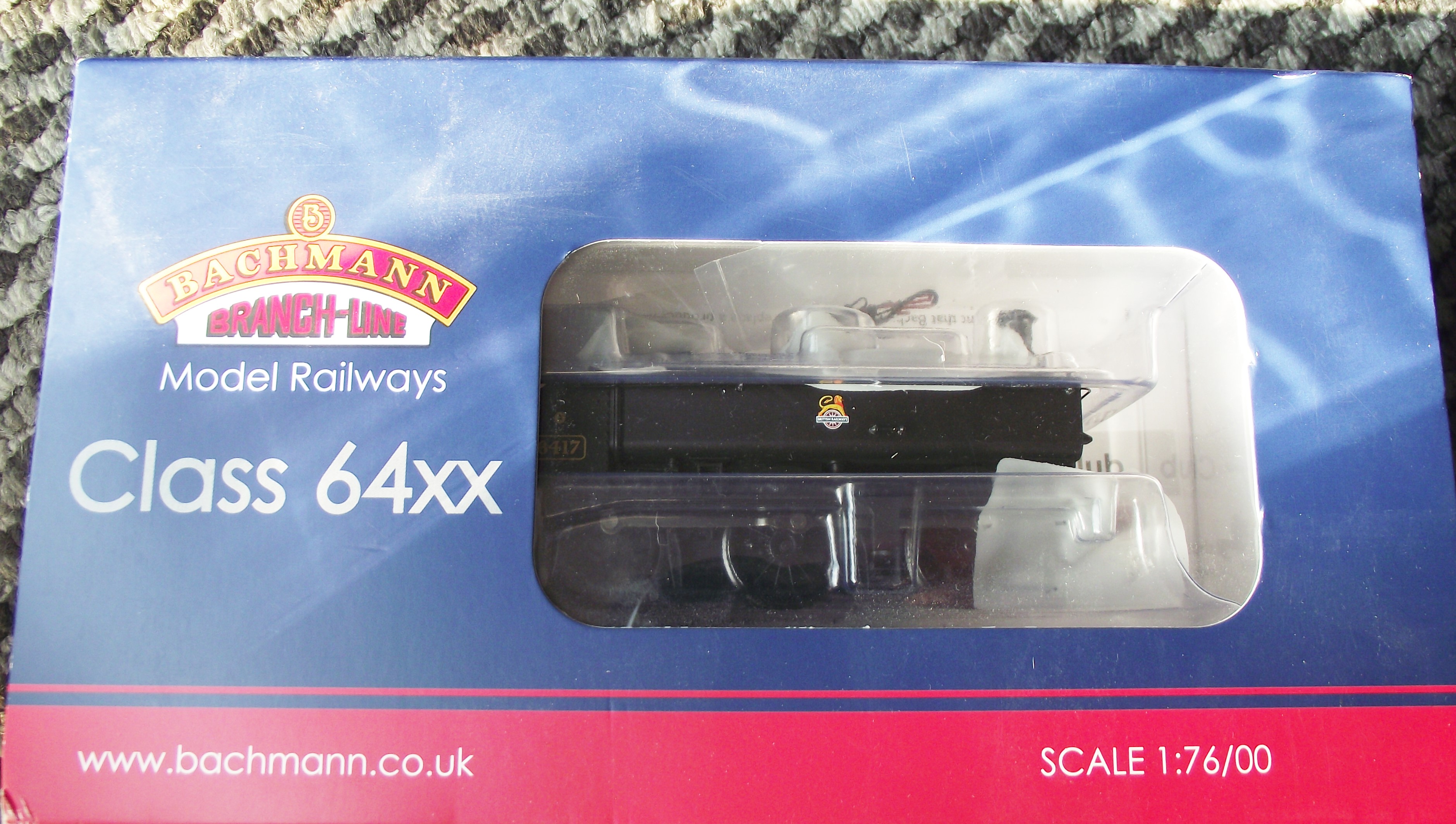 A Bachmann Branch-Line Model Railways Class 64XX Pannier Tank steam locomotive, number 6417. This 1:76/00 scale (OO gauge) model is presented in its original sealed packaging, visible through a clear plastic blister. The locomotive features a black livery adorned with a British Railways lion and wheel logo. The blue and red cardboard box displays the Bachmann branding, model class, and company website.