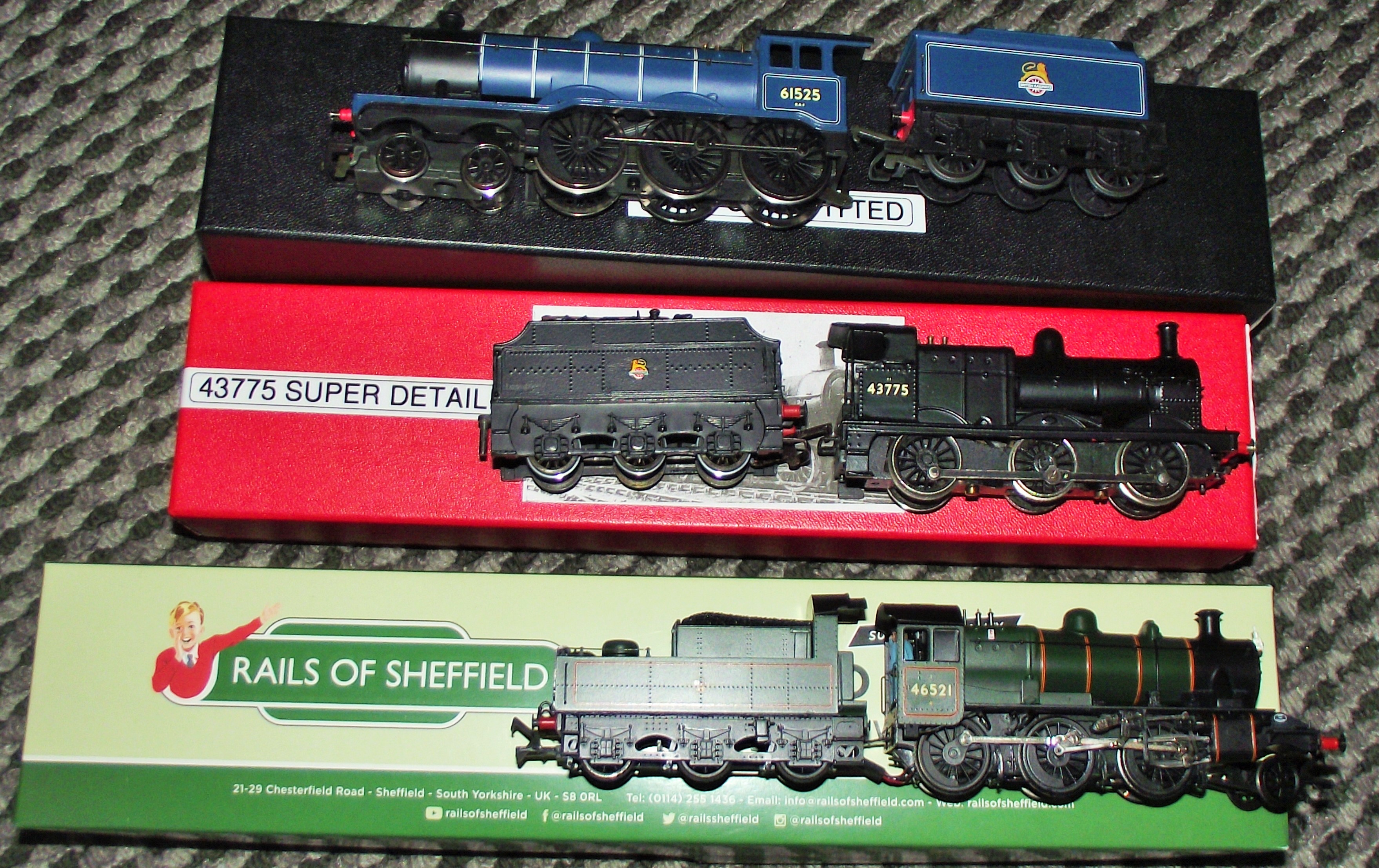 A group of three Hornby OO Gauge British outline model railway locomotive and tender sets, constructed from plastic and metal components. The first set comprises a blue steam locomotive, numbered ‘61525’ on the cab, paired with a matching tender featuring a gold crest, presented on a black display base. The second set consists of a black steam locomotive, numbered ‘43775’, coupled with a coordinating tender also displaying a gold crest, resting on a red box labeled ‘43775 SUPER DETAIL’. This model appears to be a Class 4F 0-6-0 type, consistent with S&DJR livery. The third set features a dark green steam locomotive, numbered ‘46521’, connected to a separate grey tender, showcased on a light green box with ‘RAILS OF SHEFFIELD’ branding. This model appears to be a 2-6-0 type. The top two models display livery consistent with the Somerset & Dorset Joint Railway (S&DJR).