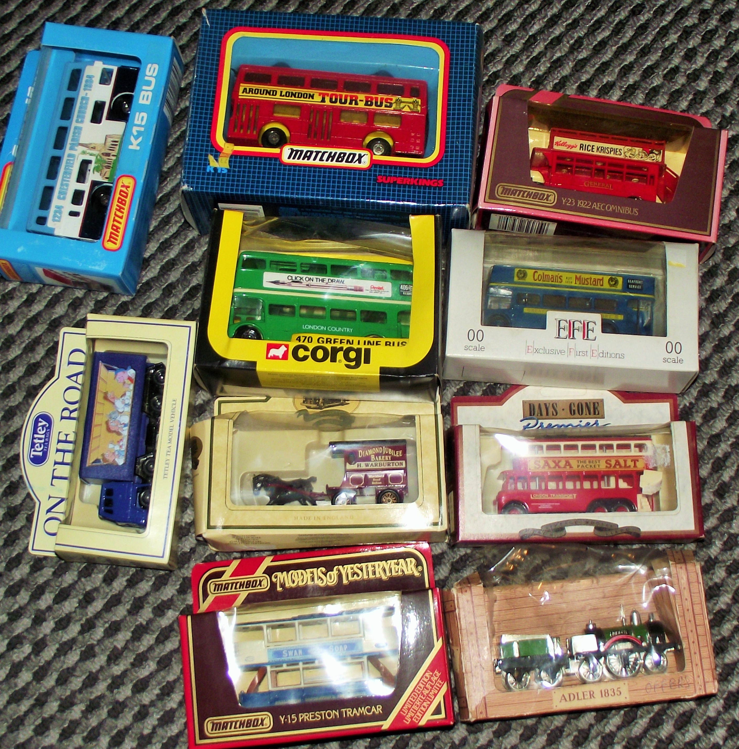 A collection of ten die-cast model vehicles, predominantly buses and other early 20th-century transport, presented in their original cardboard and plastic packaging. The collection includes various brands such as Matchbox (K15 Bus, Superkings ‘AROUND LONDON TOUR-BUS’, Y-23 1922 AEC Omnibus ‘Kellogg’s RICE KRISPIES’, Models of Yesteryear Y-15 Preston Tramcar ‘SWAN SOAP’), Corgi (470 Green Line Bus ‘LONDON COUNTRY’ with ‘Pentel’ advertisement), EFE (Exclusive First Editions ‘Colman’s Mustard’ bus), Tetley (“On The Road” Tea Model Vehicle), and Days Gone Premier (‘SAXA THE BEST PACKET SALT’ bus). Also included are a horse-drawn ‘Diamond Jubilee Bakery’ van and an ‘ADLER 1835’ steam locomotive. Liveries and advertising vary across the models, including “CHESTERFIELD PARISH CHURCH – 1234” on one Matchbox K15 bus. One Matchbox Models of Yesteryear box is marked “LIMITED EDITION / ÉDITION LIMITÉE”.