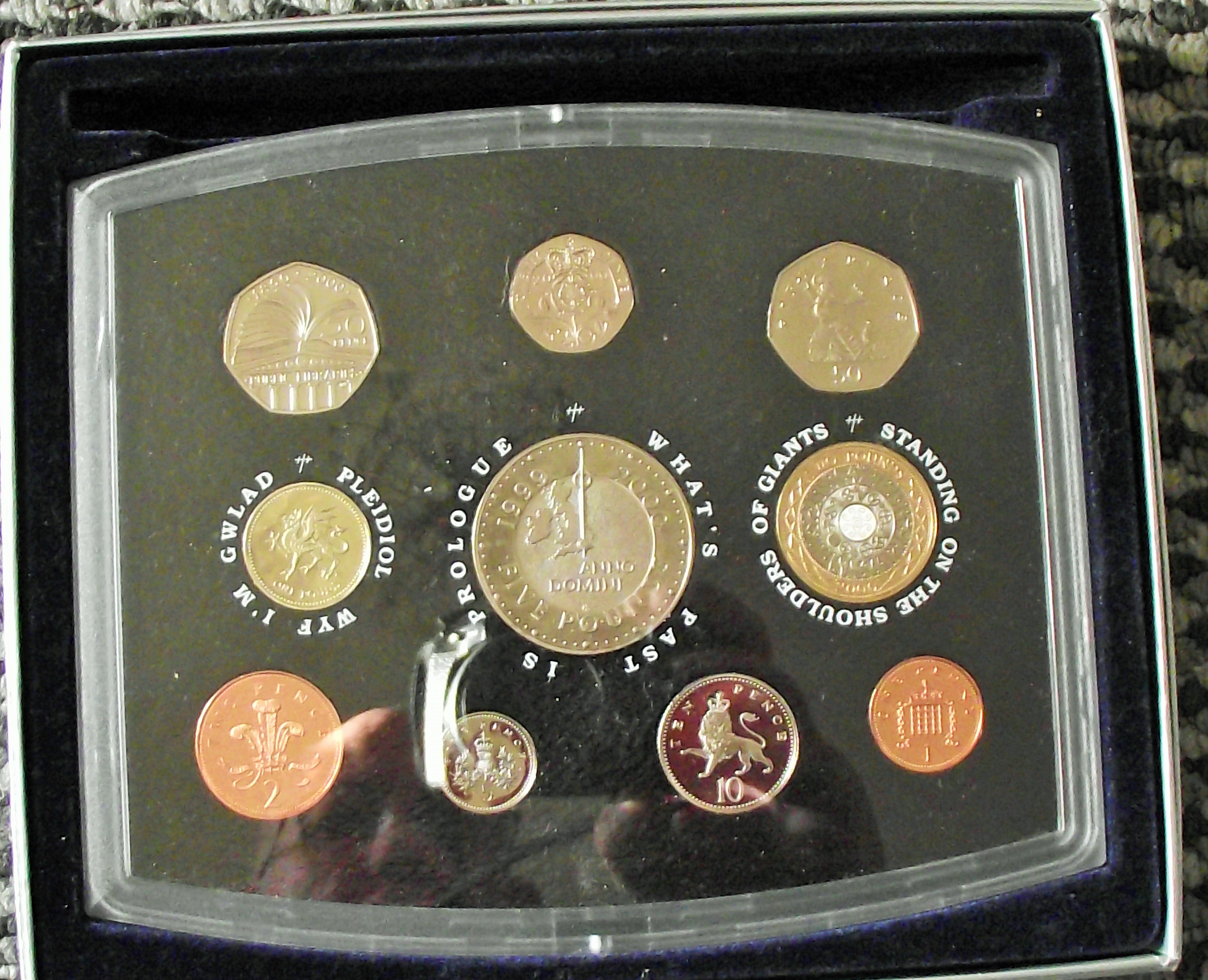 A United Kingdom Royal Mint 2000 Proof Coin Collection. This collection comprises eight modern coins, presented in a clear plastic display insert within a dark, velvet-lined, hinged presentation box. The set includes predominantly gold-toned and two copper-toned metallic coins. Visible dates include “2000” on several coins and “1999” on the central large coin. Denominations such as “FIVE POUNDS, ” “50 PENCE, ” “10 PENCE, ” and “2 PENCE” are present. Inscriptions visible include “STANDING ON THE SHOULDERS OF GIANTS, ” “WHAT’S PAST PROLOGUE, ” and the Latin “ELIZABETH II D G REG F D.” One coin prominently features the Welsh phrase “GWLAD PLEIDIOL WYF I, ” which translates to “True Am I to My Country.” The imagery includes various heraldic designs, such as crowns, lions, and a seated Britannia.