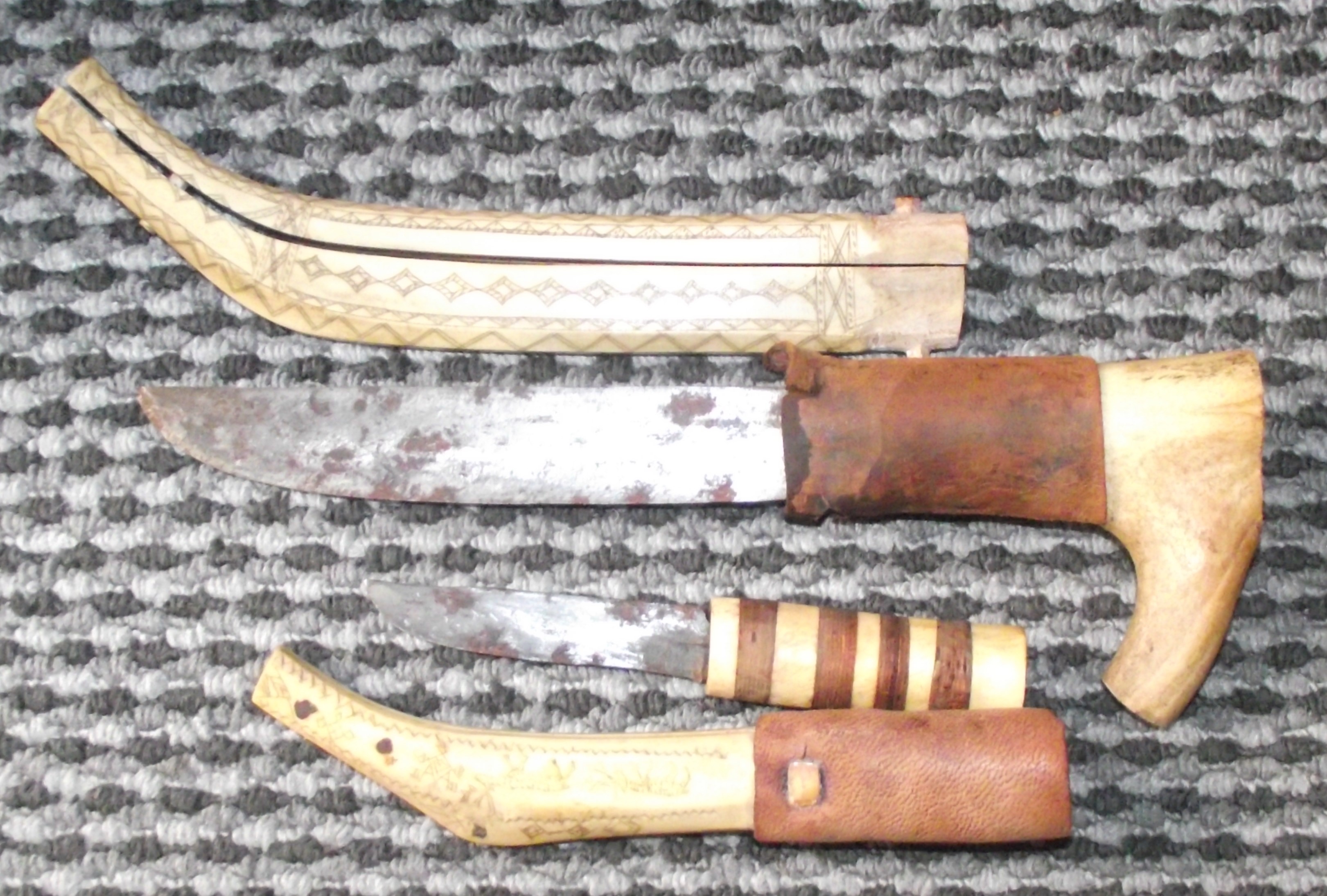 Both knives exhibit significant surface corrosion and pitting to their metal blades. The organic materials of the handles and sheaths show considerable age and use, with natural wear and patination consistent with their age.