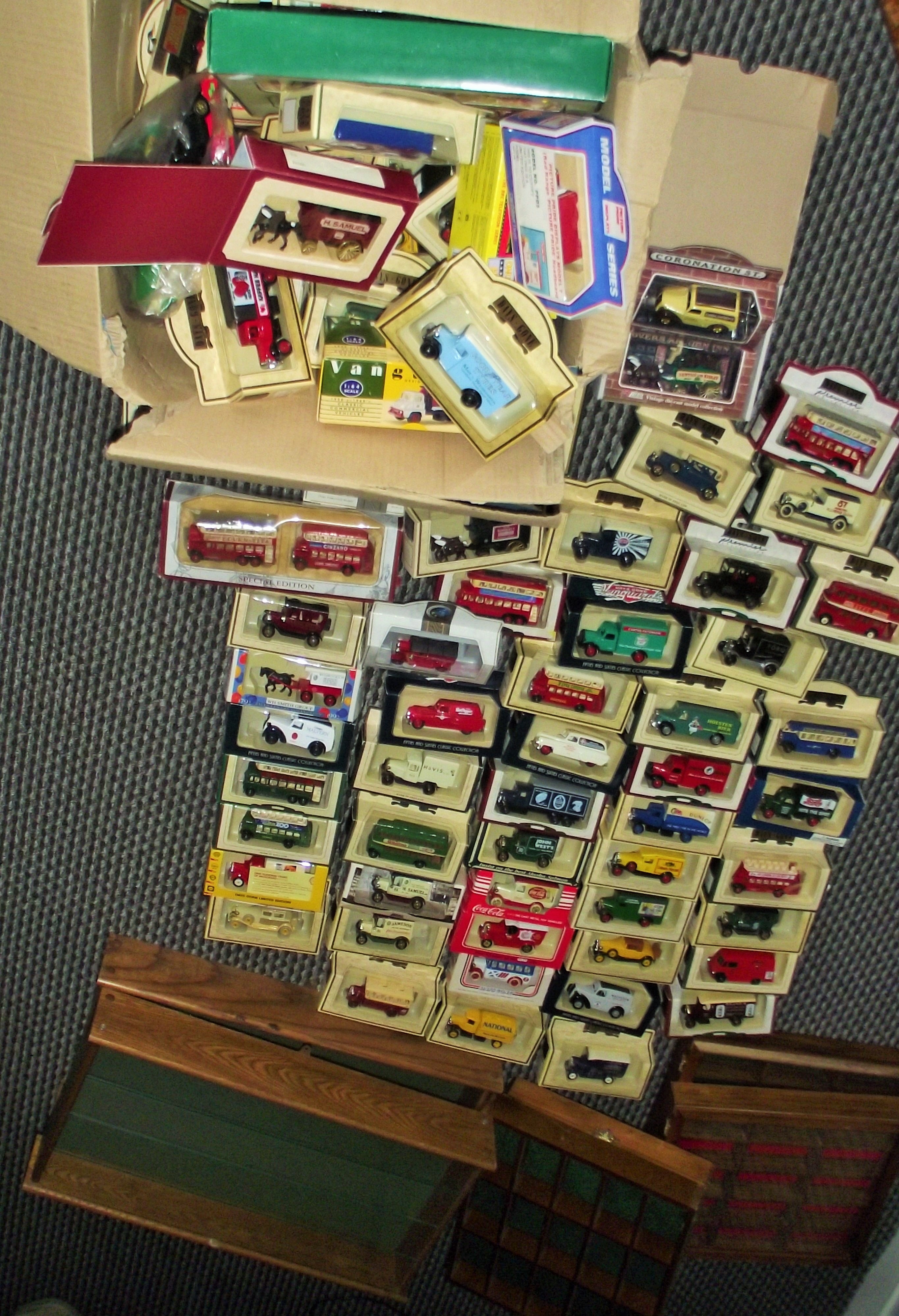 Large selection of collectors days gone by vehicles including some highly collectable versions . some laid out +very large box full of similar and display cabinets
