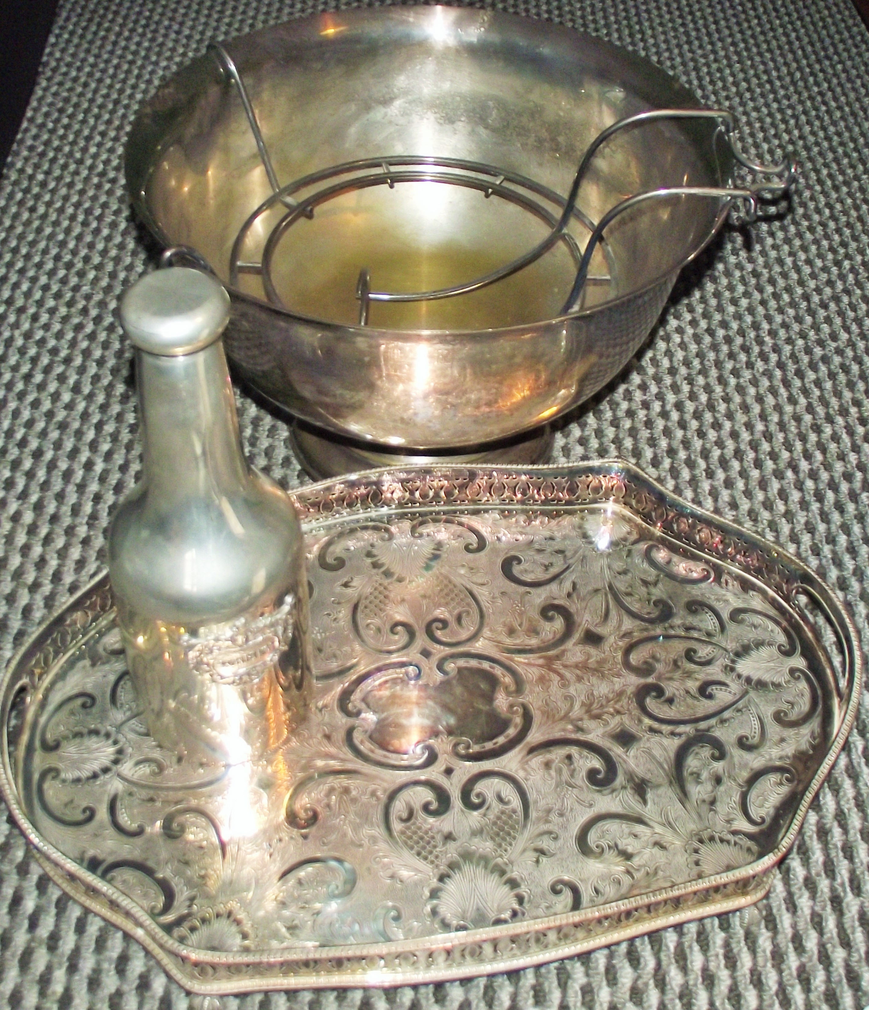 Large silver plated Champion cooler + silver plated tray + Pewter bottle with embossed label Whisky