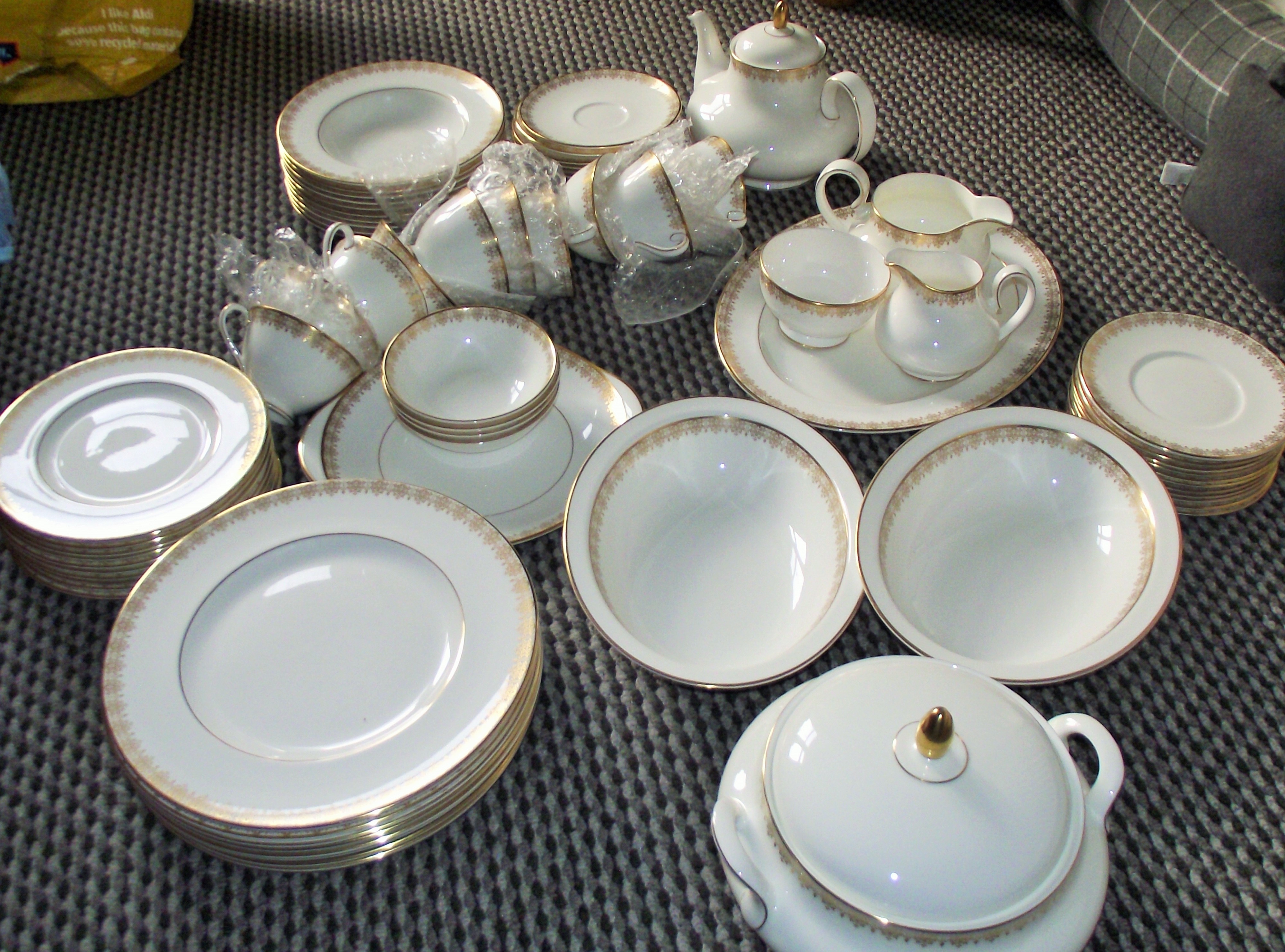 A large collection of 74 pieces of dinnerware attributed to Royal Doulton in the Gold Lace pattern (H4989). The set is constructed of bright white ceramic or porcelain, likely bone china based on the pattern identification, and features heavy gilt decoration. The design includes a solid gold band applied to the rim of each piece, complemented by an inner border of delicate gold lacework or filigree pattern. The collection comprises a diverse range of components suitable for a full dinner service and tea service, including 10 large dinner plates, 15 medium plates, 20 small plates/saucers, 4 small bowls, 2 large serving bowls, 1 lidded teapot, 1 lidded tureen/casserole, 6 teacups, 1 serving tray, 1 milk jug/creamer, and 1 open serving bowl (or sugar bowl) etc .