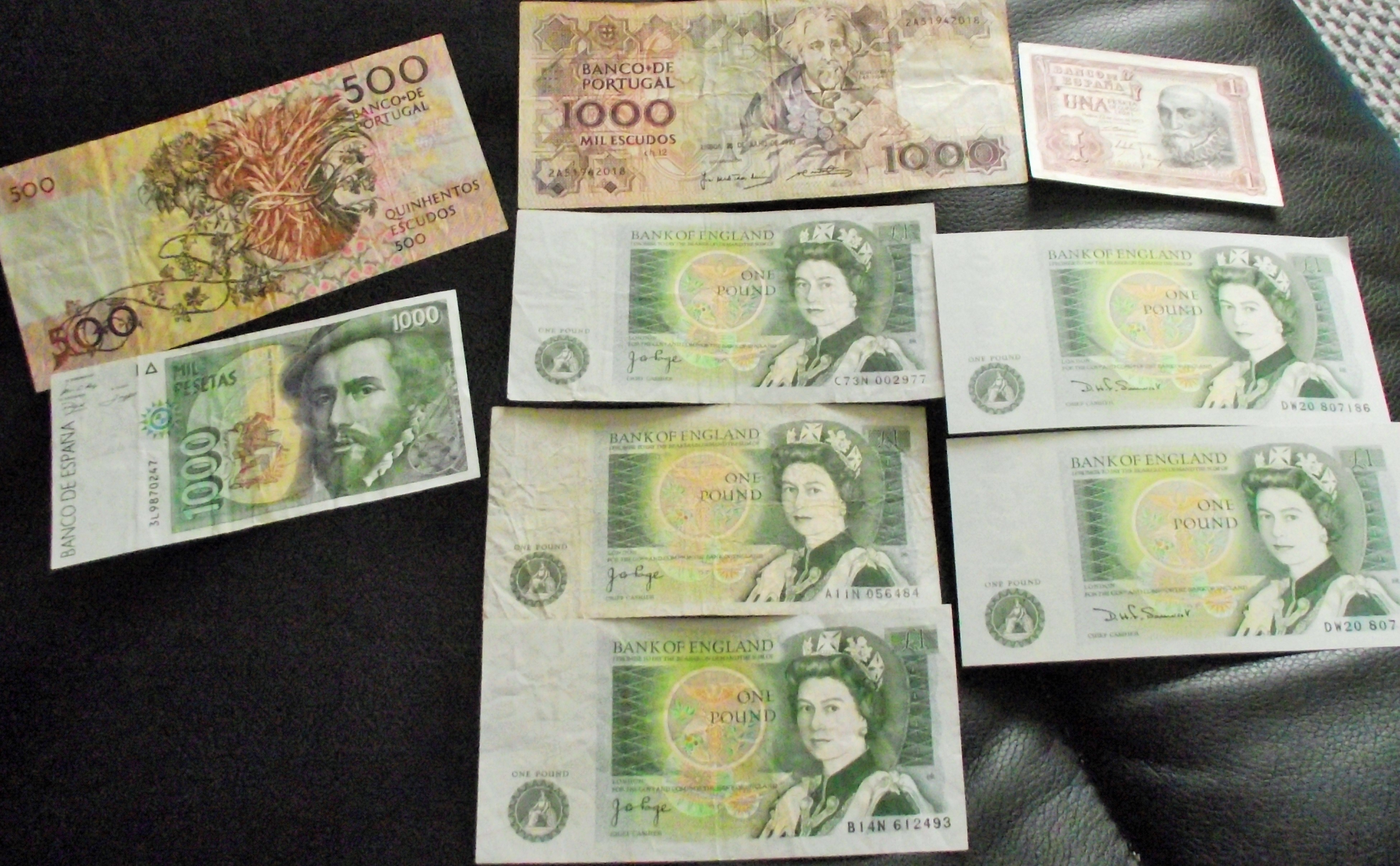 A collection of nine (9) circulating paper banknotes from three European issuers: Great Britain (UK), Portugal, and Spain.