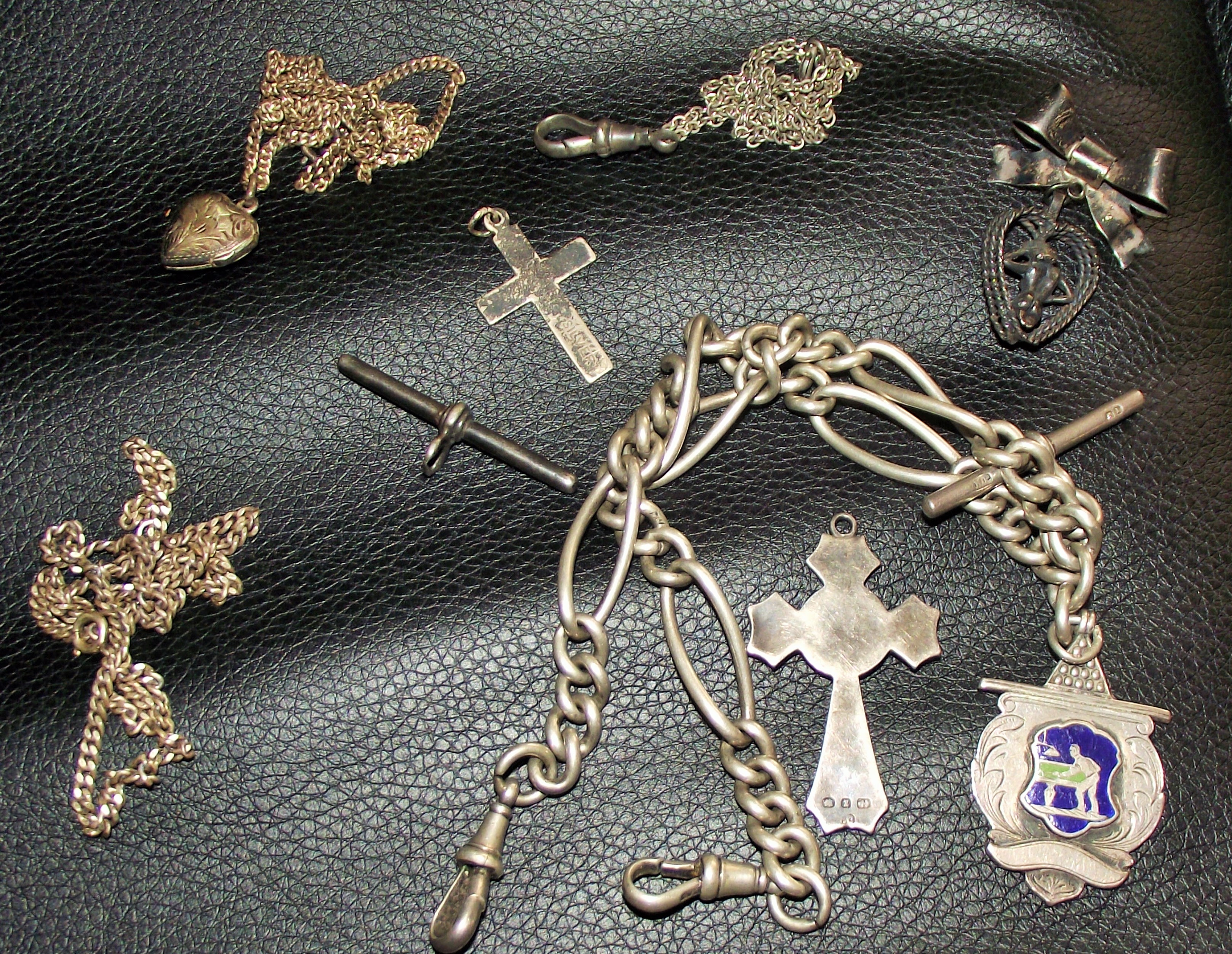 Silver double albert chain with elongated links marked on each link+ Silver crosses , T bar , locket & chain , brooch 100g approx etc