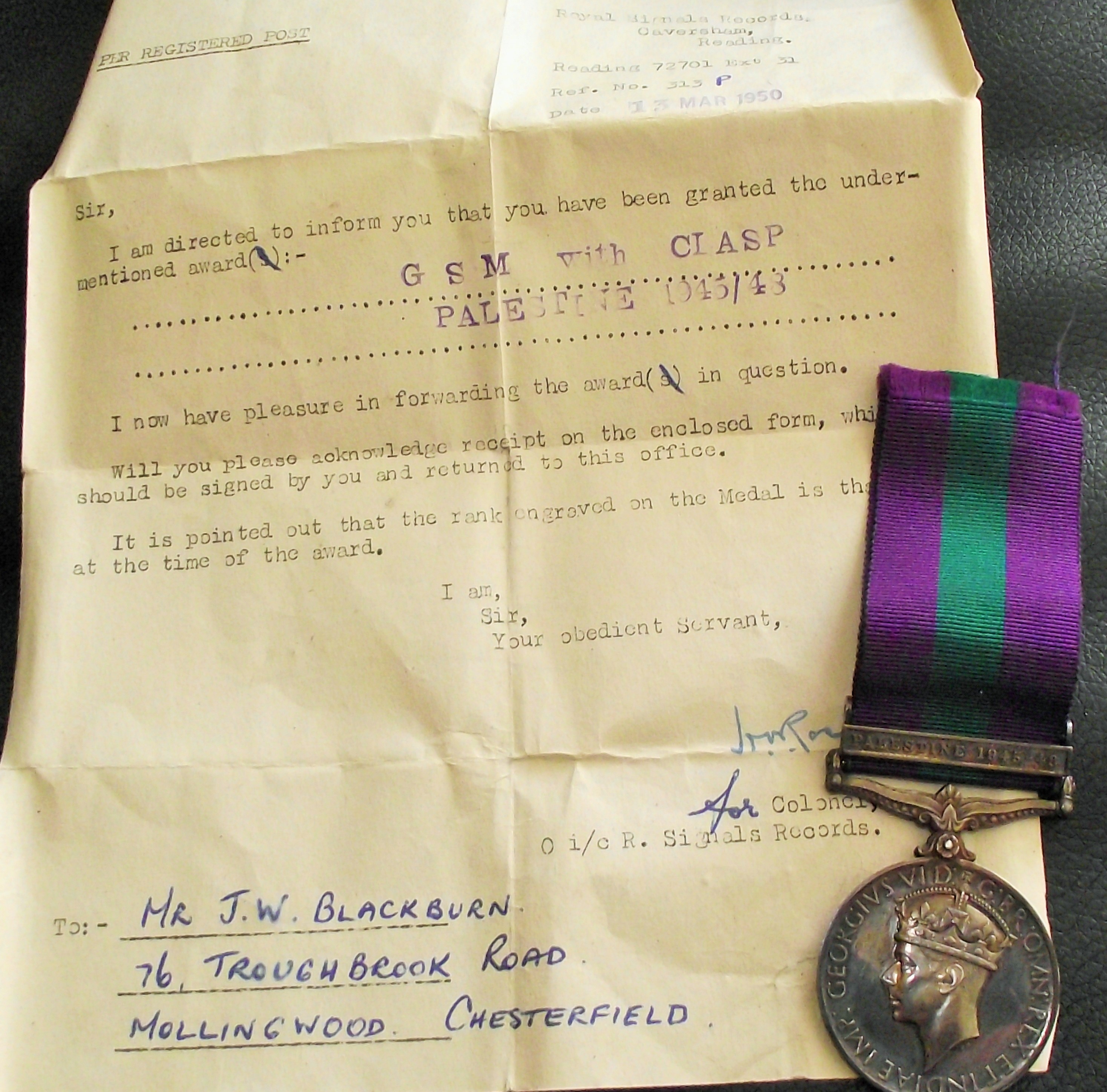 A British military collectible awarded to Mr. J.W. Blackburn, Royal Signals. The collection includes the King George VI General Service Medal (GSM) and its original award notification letter. The medal features the crowned effigy of King George VI on the obverse, inscribed “GEORGIVS VI D:G: BR: OMN: REX F:D: IND: IMP:”. It is suspended from the original striped ribbon (purple, green, and black) and bears the engraved bar clasp “PALESTINE 1945-48”. The accompanying document is a typed letter dated 13 MAR 1950 from Royal Signals Records, Caversham, confirming the award of the GSM with the Palestine 1945/48 clasp. The recipient’s name and address are clearly handwritten in blue ink on the document, providing strong provenance.