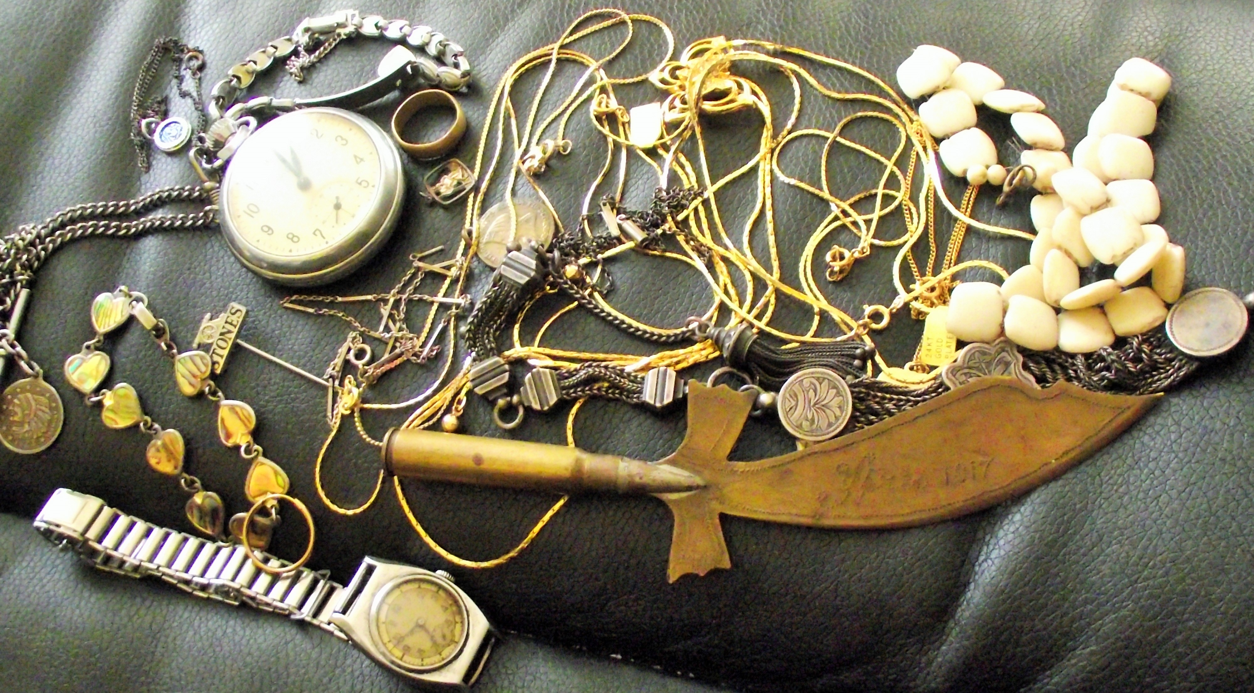 A varied collection lot inc 24k gold plated costume jewellery, chatelaine chain , smiths pocket watch on doulble albert chain(seen working) trench art knife date 1917 , Vintage Laco german stainless steel watch( seen working ). etc