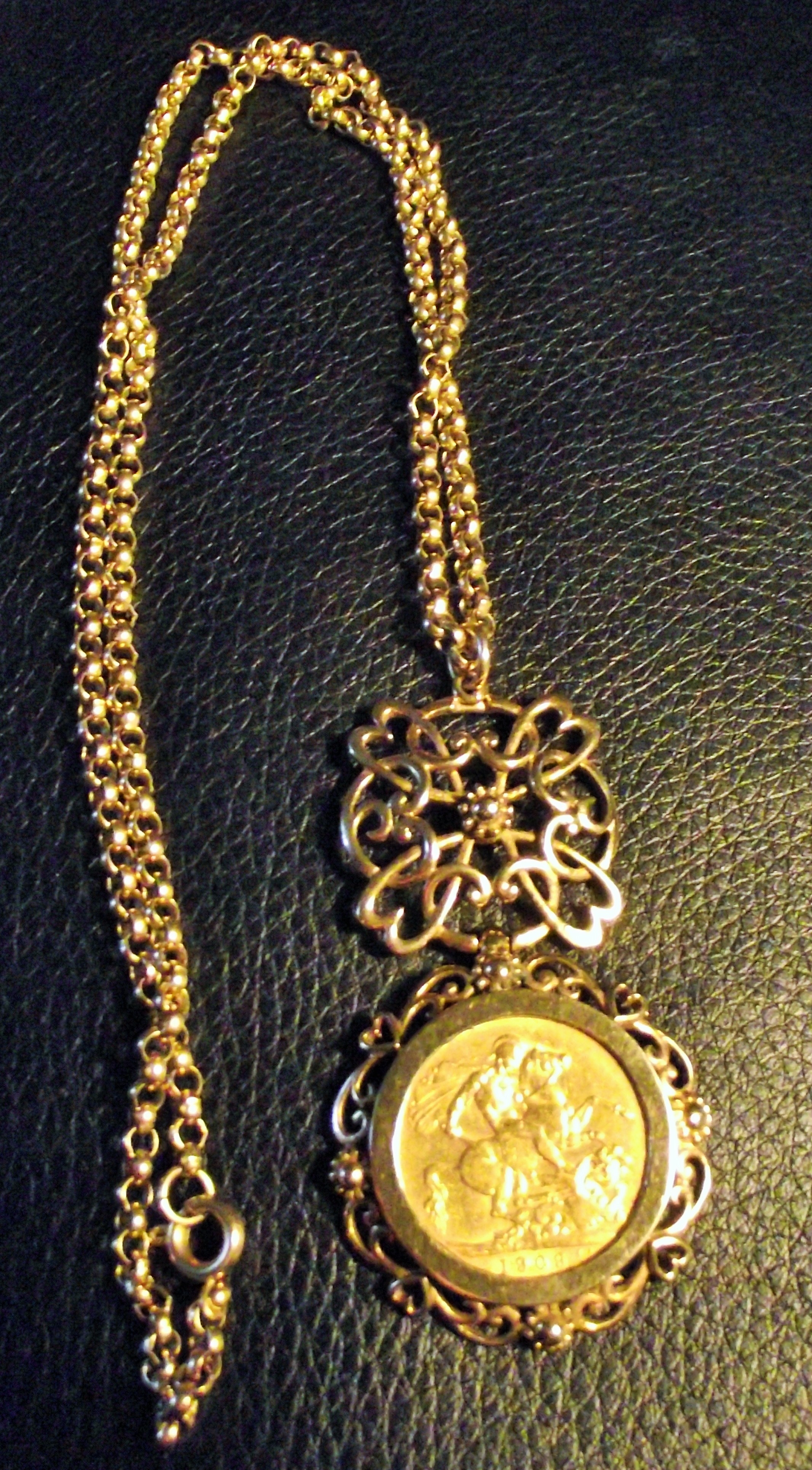A substantial Ladies 9ct gold open work pendant on 9ct gold chain with 1909 full sovereign 27g approx