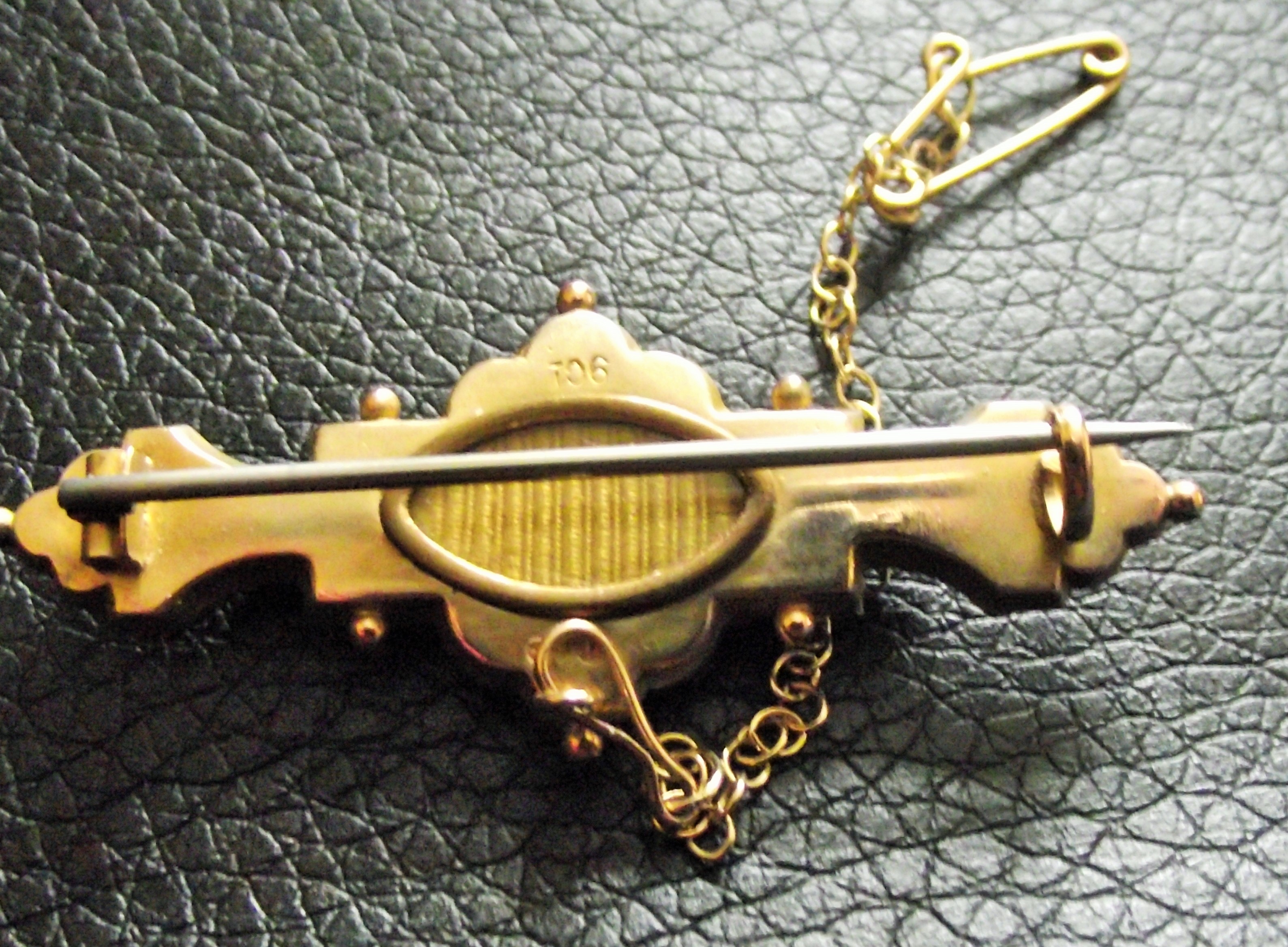 Edwardian 9ct gold brooch with steel pin fastener with central emerald green stone in centre flanked by 2 small diamonds one on each side 2.95g approx