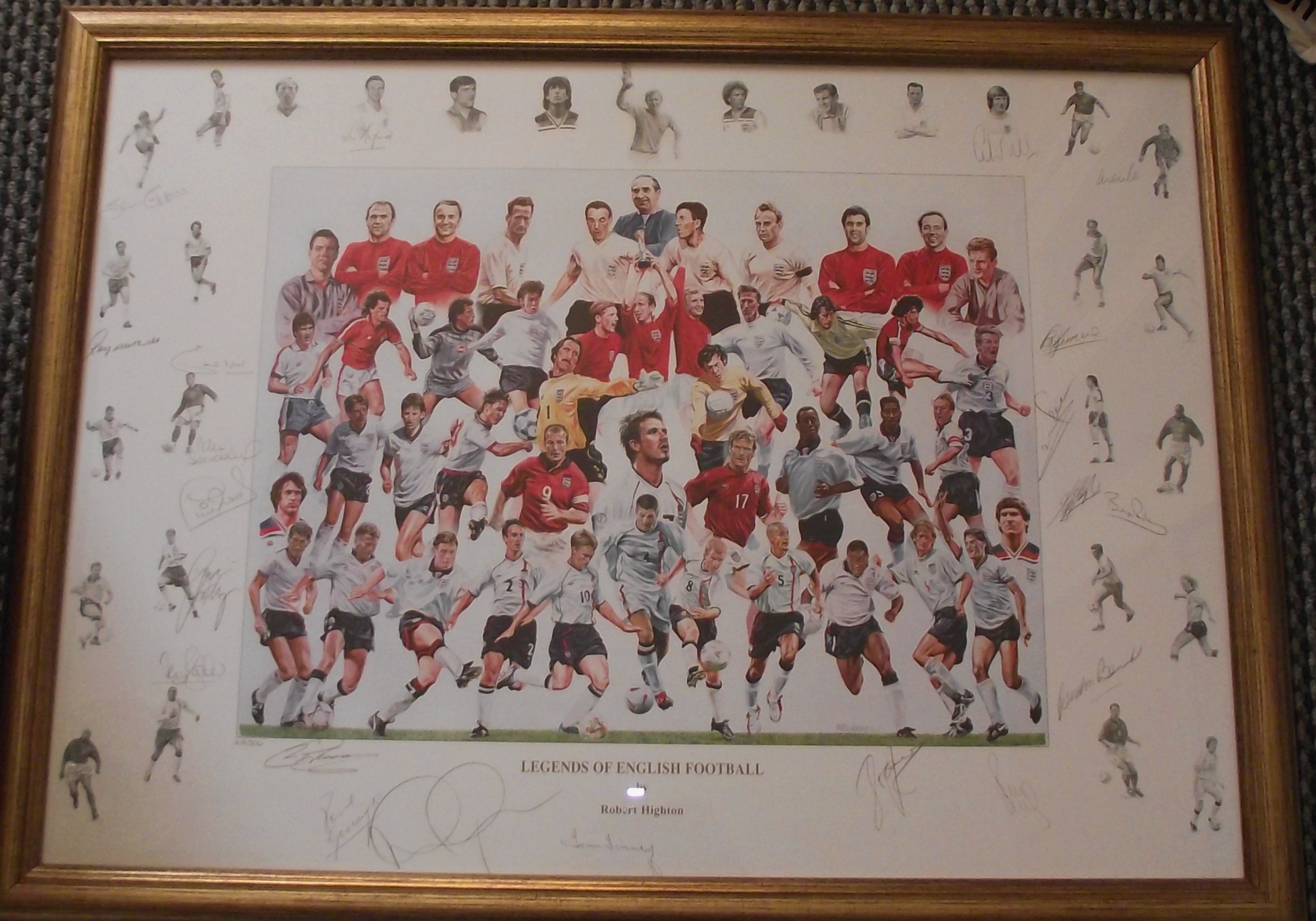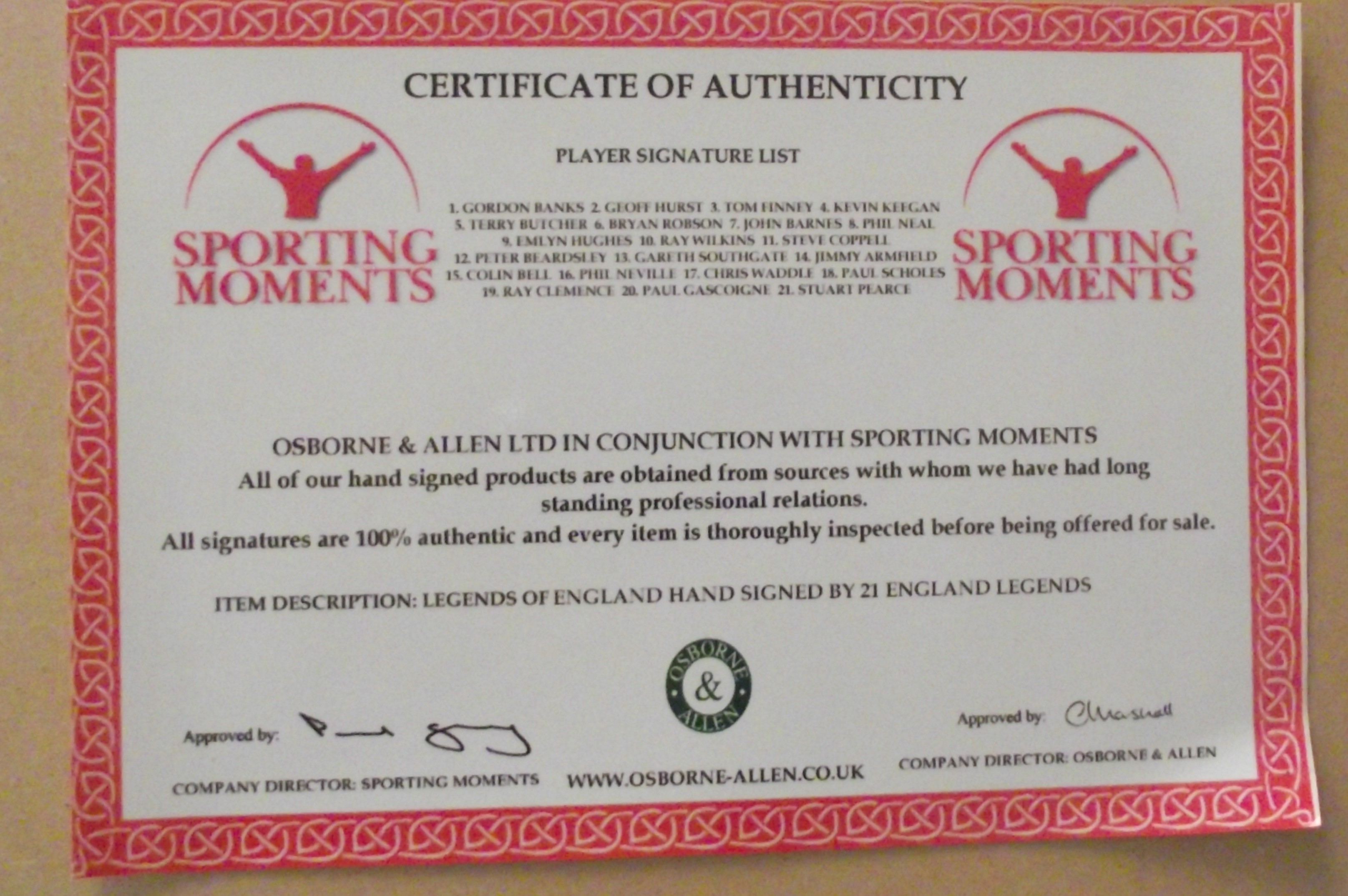 This lot consists of a pair of items: a large framed print and its corresponding Certificate of Authenticity (COA). The primary item is a framed print titled “LEGENDS OF ENGLISH FOOTBALL” by artist Robert Highham, depicting a crowded, dynamic montage of English footballers in action, set within a thick gold-toned frame under glass. The print is extensively hand-signed across the image and border areas. The accompanying Certificate of Authenticity (COA) is issued by Osborne & Allen Ltd in conjunction with Sporting Moments. The COA verifies that the item is hand-signed by 21 England Legends, including notable figures such as Gordon Banks, Geoff Hurst, Kevin Keegan, Terry Butcher, Bryan Robson, John Barnes, Phil Neal, Stuart Pearce, and Paul Scholes. The COA is printed on white paper featuring a distinctive pink/red decorative border and Sporting Moments logos, confirming the authenticity of the signatures.91x67cm approx