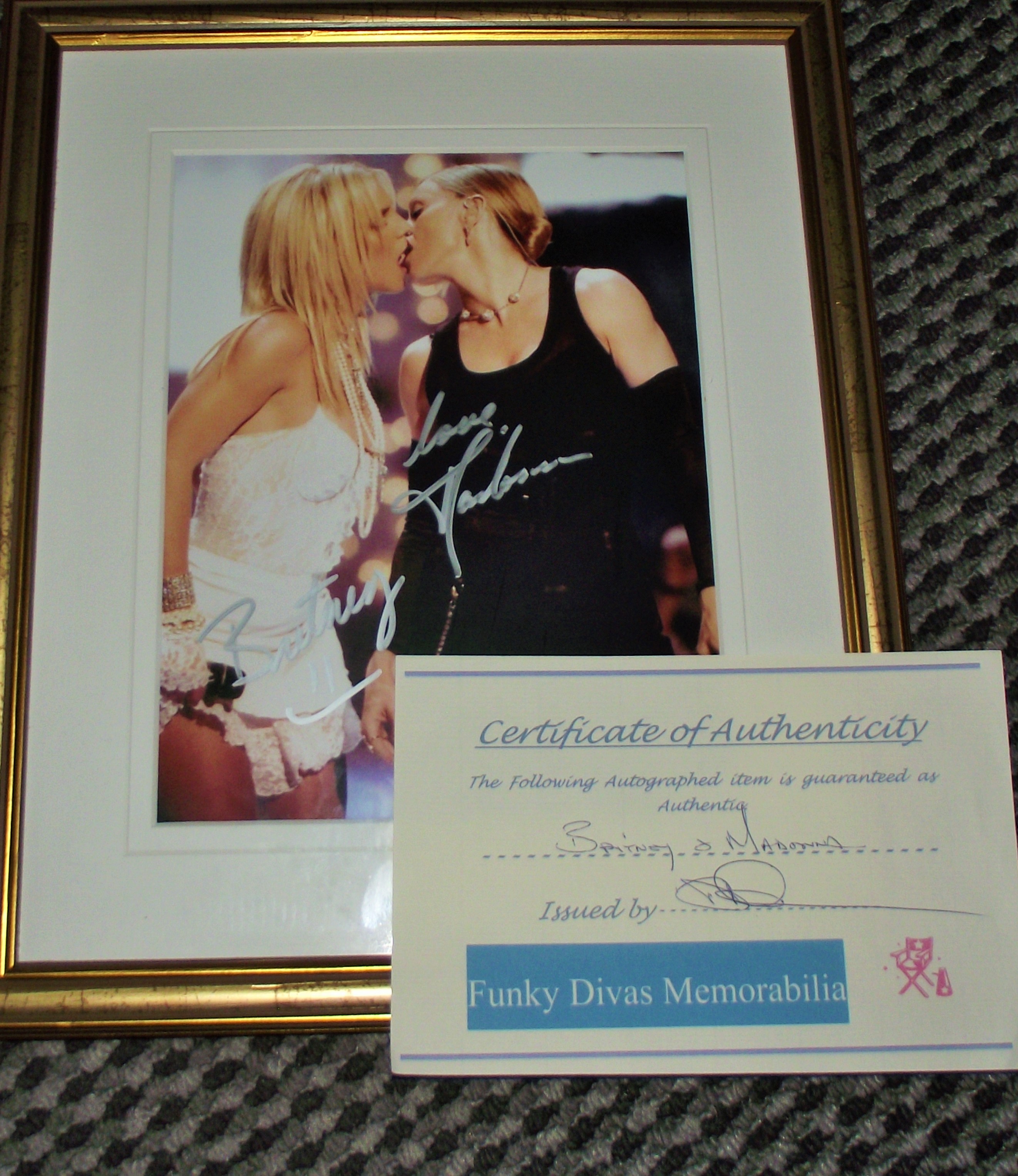 A pair of collectibles featuring a framed color photograph capturing the iconic 2003 MTV Video Music Awards kiss between Madonna and Britney Spears. The photograph features facsimile signatures attributed to Britney Spears and Madonna (with the inscription “Love”) in a light-colored ink. not genuinely hand-signed. The lot includes the framed photograph and a loose Certificate of Authenticity (COA) card issued by Funky Divas Memorabilia, which purports to verify the authenticity of the signatures.38x33cm approx framed