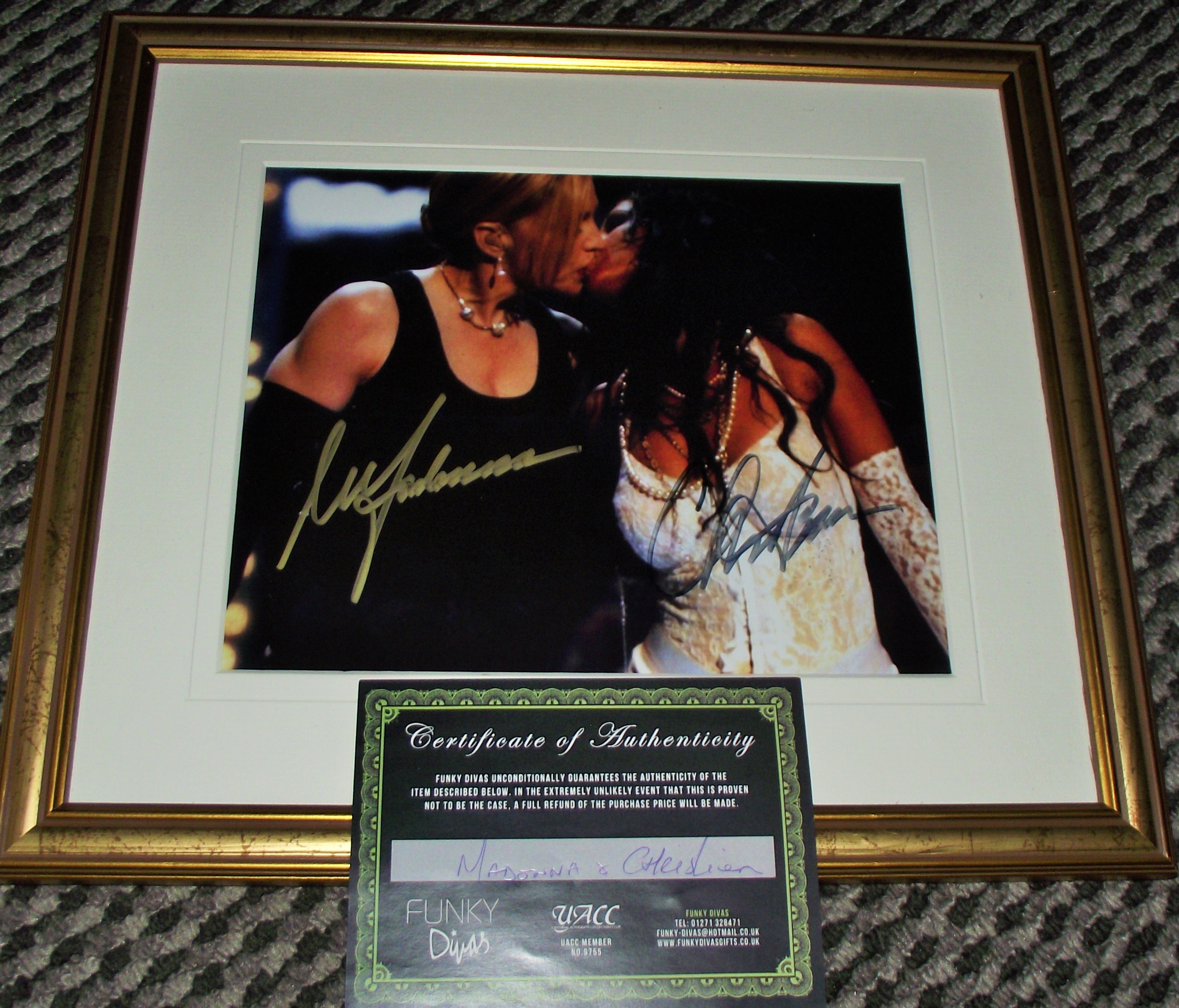 A pair of memorabilia items consisting of one framed color photograph and one Certificate of Authenticity (COA). The primary item is a high-quality color photograph (or print) depicting the famous moment from the 2003 MTV Video Music Awards where pop icons Madonna and Christina Aguilera are shown in close proximity, appearing to kiss. The image is professionally matted in white and housed within a wide, gilded, gold-toned wooden frame. The photograph bears two apparent handwritten signatures: the subject on the left (Madonna) is signed in light yellow/gold ink across her torso, and the subject on the right (Christina Aguilera) is signed in darker blue/black ink across her chest. The framed piece is accompanied by a rectangular, dark green/black Certificate of Authenticity card from Funky Divas (UACC Member No. 9755). The COA confirms the authenticity of the item described as “Madonna & Christina.” 38x33cm framed
