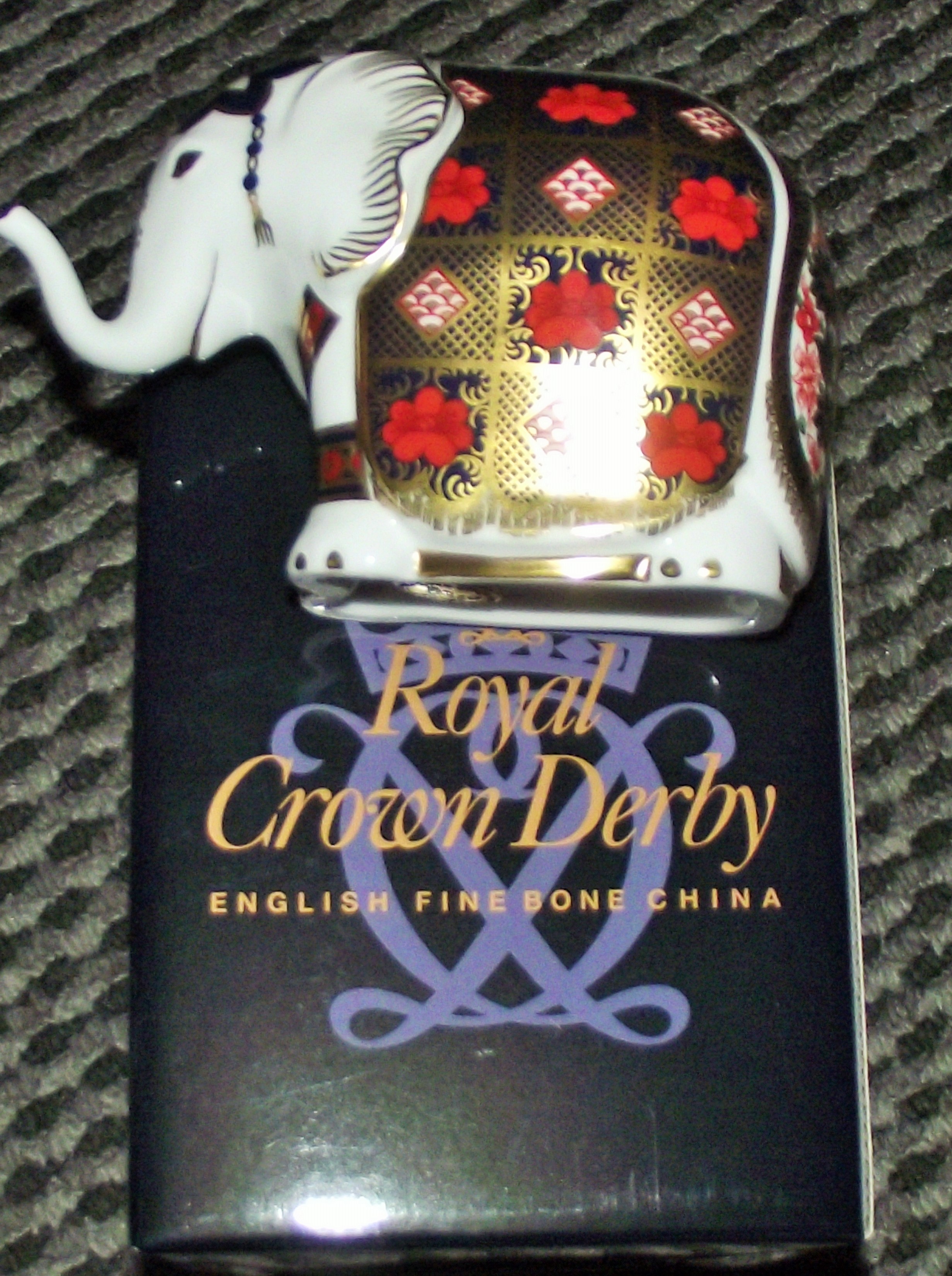 A Royal Crown Derby Gold stopper Small Elephant paperweight, executed in English fine bone china and decorated in the traditional Imari palette. The figurine depicts a standing elephant with its trunk raised. The white bone china body is decorated with heavy polychrome enameling and rich gilding, forming a ceremonial caparison or blanket pattern utilizing red floral motifs, geometric patterning in gold, dark blue, and pink/white.
