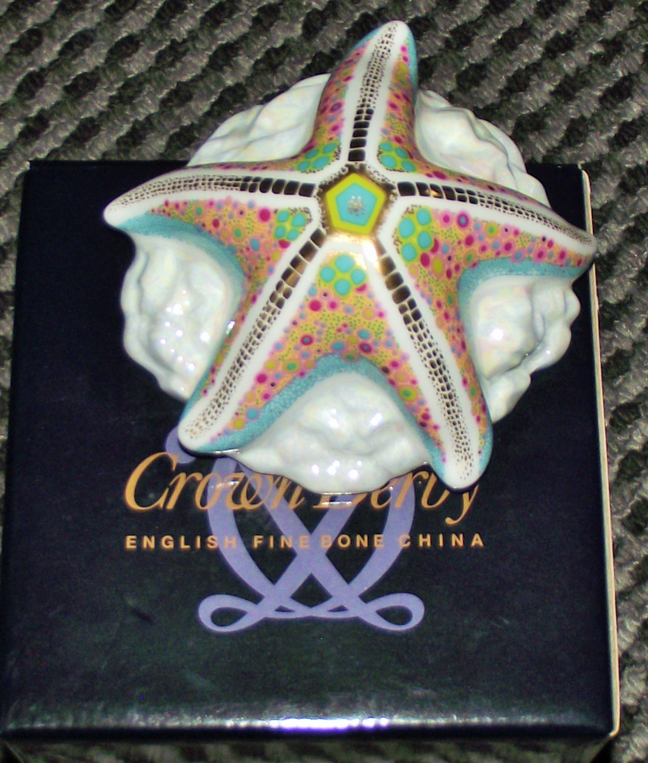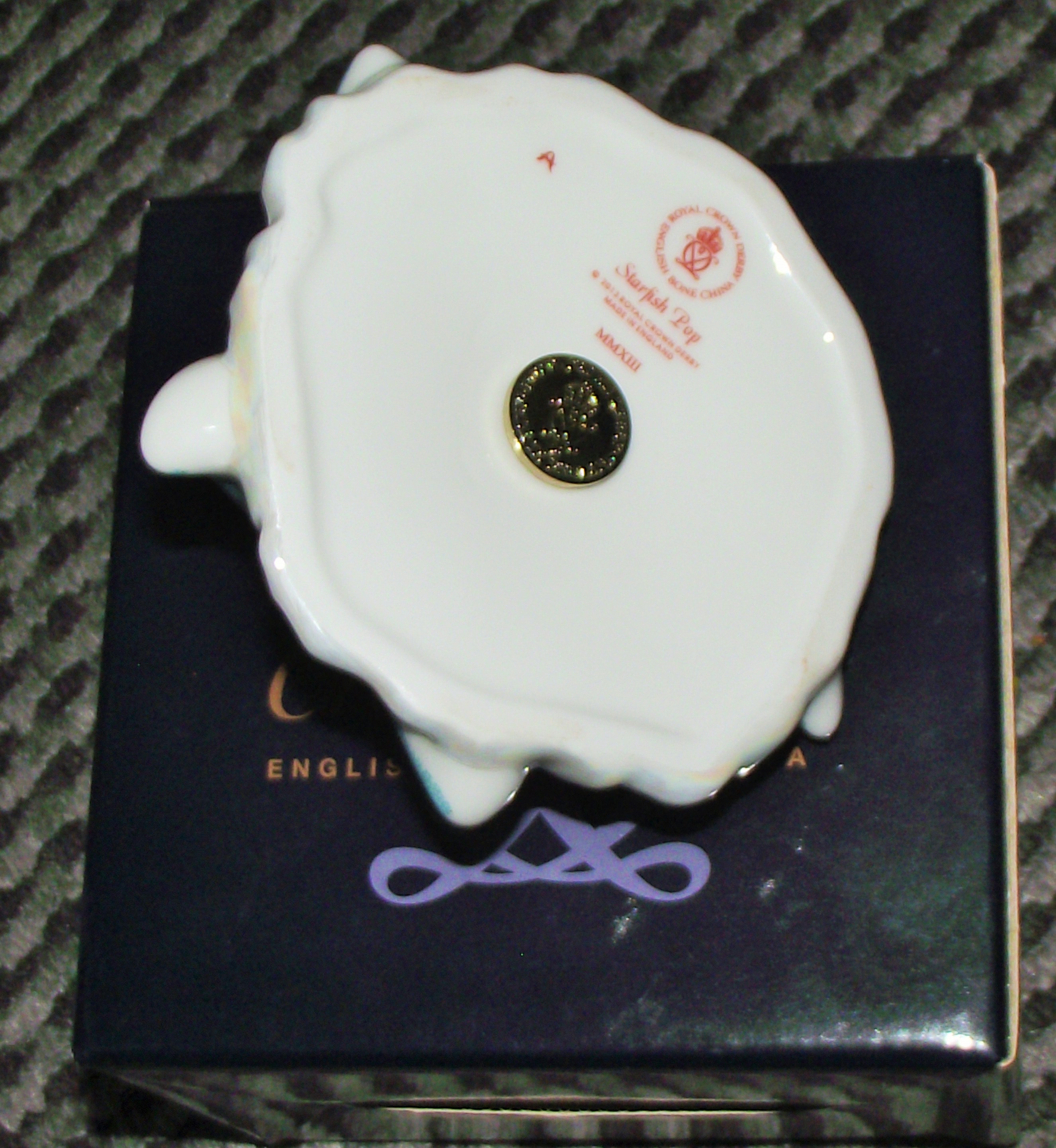 A single Royal Crown Derby gold stopper Starfish Pop paperweight, executed in English Fine Bone China. The highly stylized starfish features five arms decorated with vibrant polychrome enamels, including pink, yellow, and teal dots, with black and gold accents outlining the segments. The starfish rests upon a textured white base. The underside bears the Royal Crown Derby crowned ‘D’ logo, the title “Starfish Pop, ” the designation “A ROYAL CROWN DERBY EXCLUSIVE EDITION MADE IN ENGLAND, ” and the date MMXIII (2013) in red script. A central gold medallion plug is also present. The item is accompanied by its original navy blue presentation box, marked “Crown Derby ENGLISH FINE BONE CHINA.”