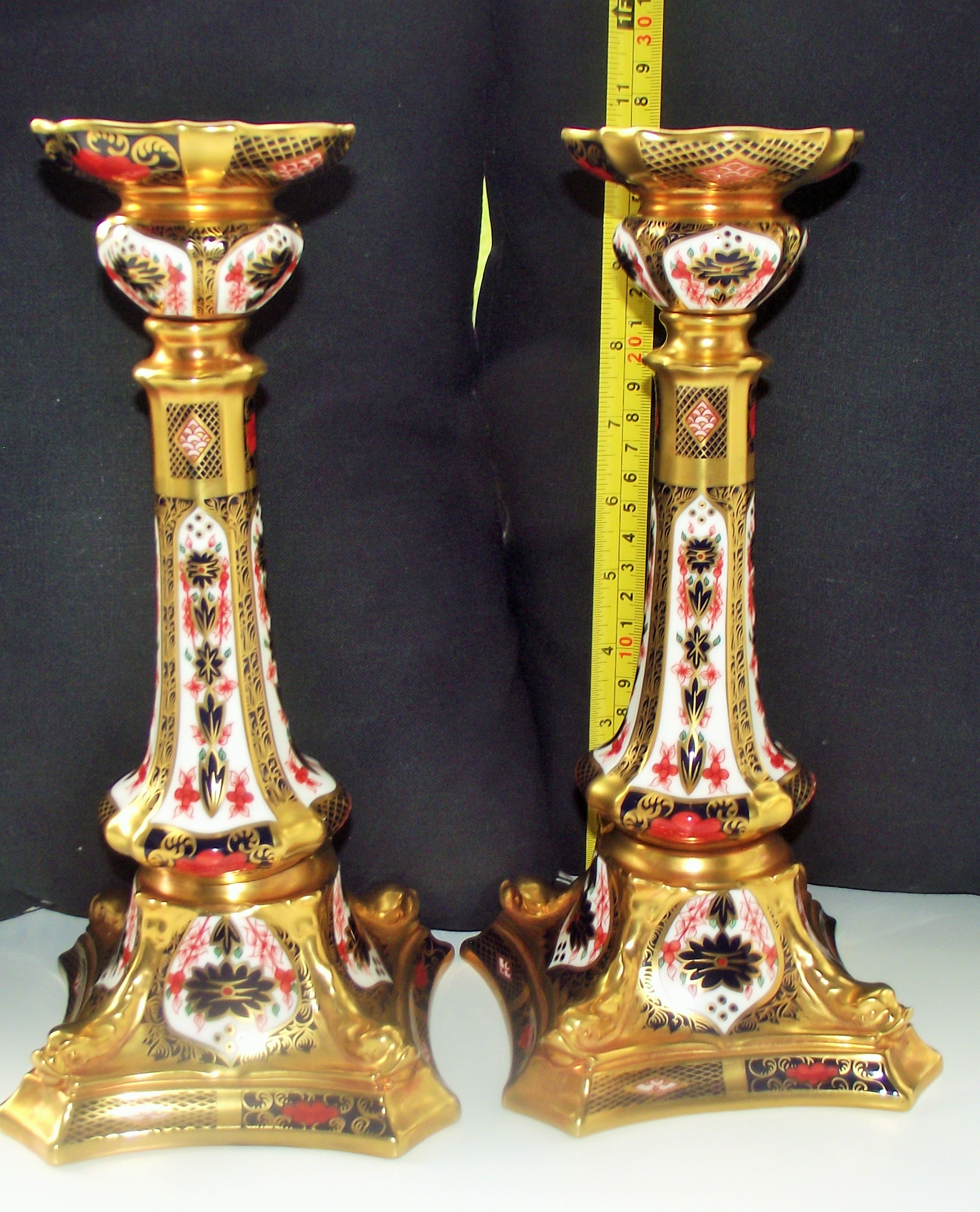 Royal Crown Derby old Imari 1128 solid gold band candle sticks 1st quality 11″ approx