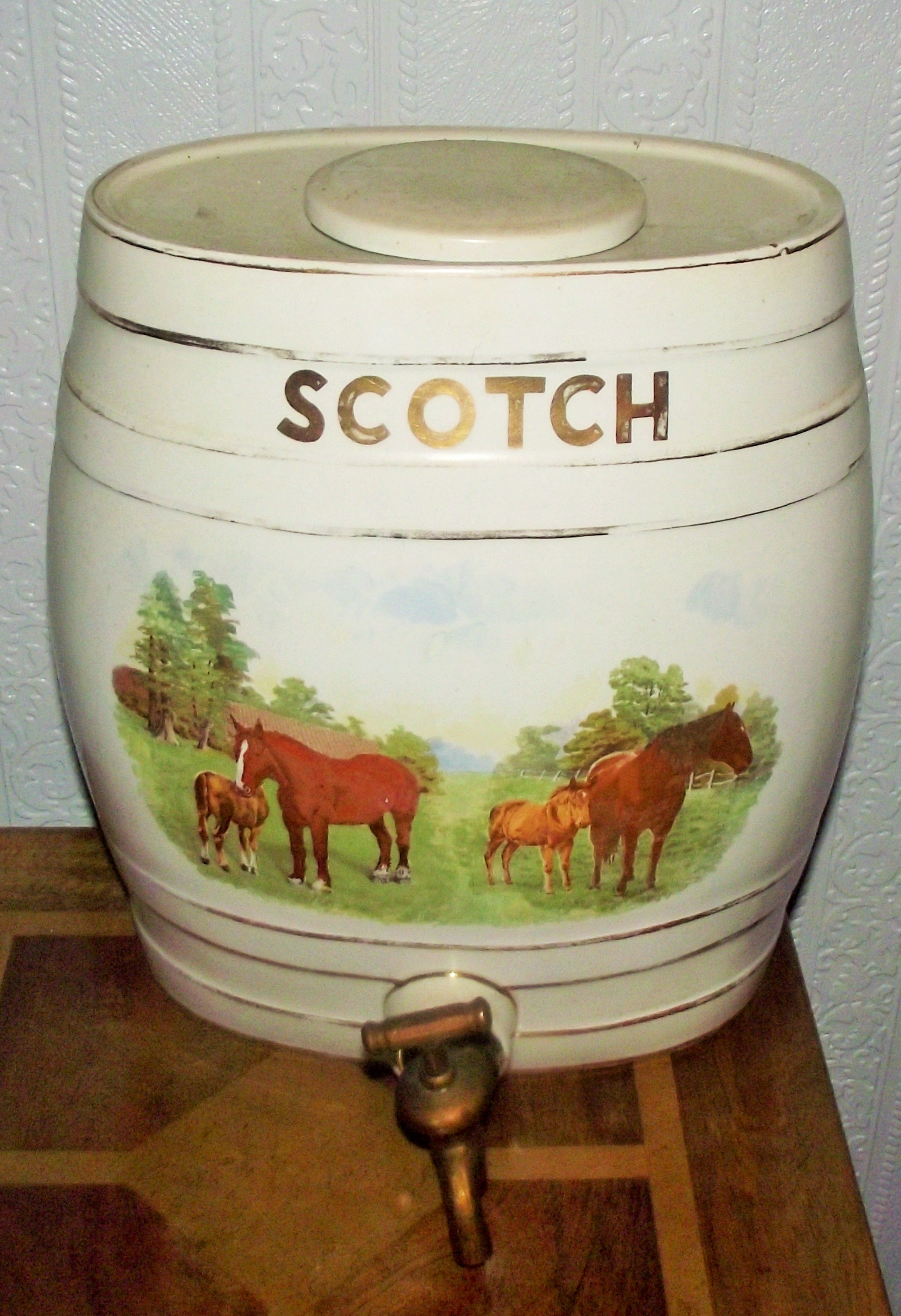 The item is in good vintage condition with wear consistent with age and professional use. Notable rubbing and loss are present on the gold-toned SCOTCH lettering, particularly on the letter O. The dark pigment in the horizontal bands shows thinning and minor losses. The horse scene remains clear and vibrant. Minor dark surface scuffs and small marks are present on the white ceramic body, primarily around the upper rim and base. No major chips or cracks are visible from the primary viewing angle. The metal spigot shows a darkened, aged patina and signs of use; the functional state has not been tested.