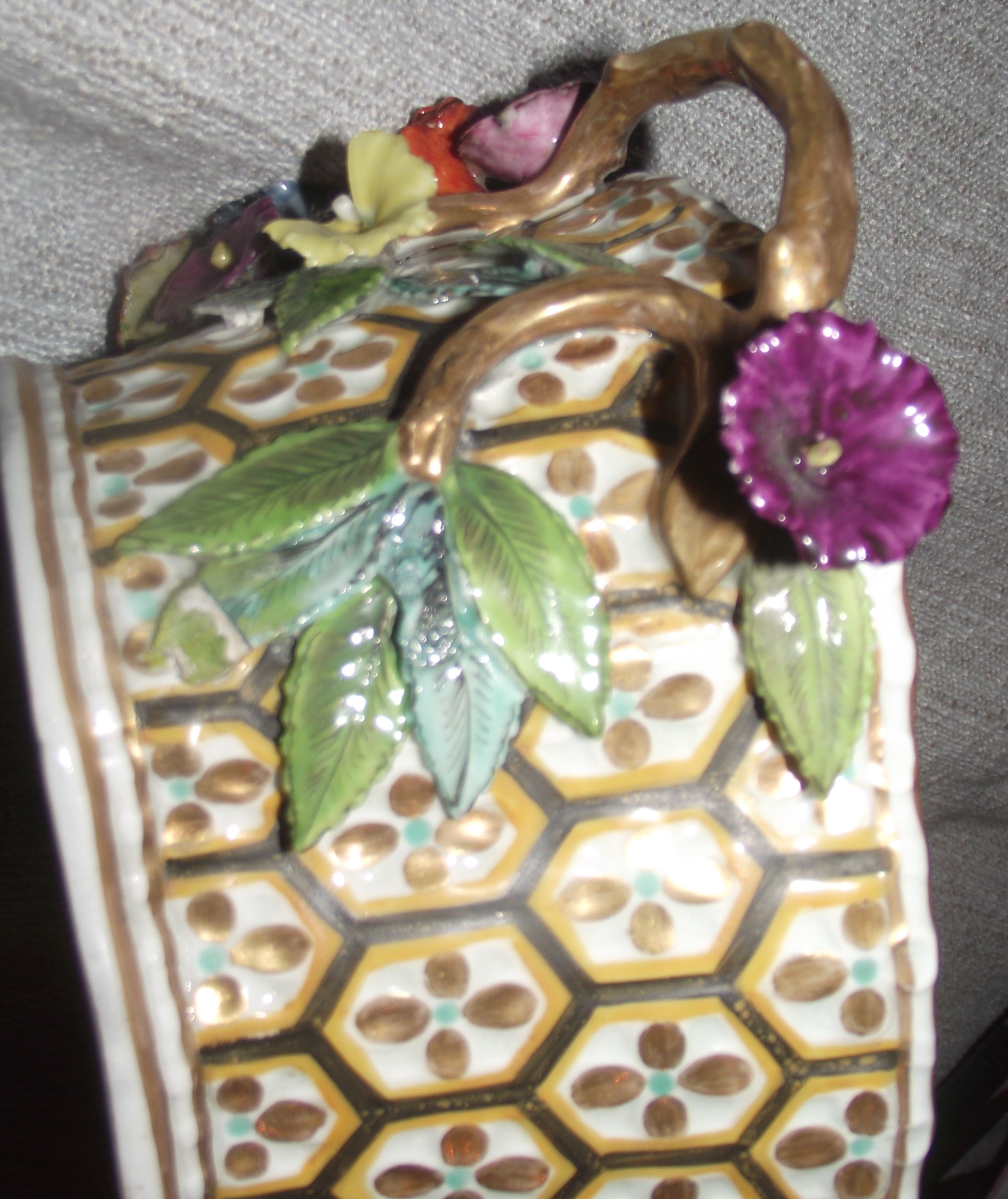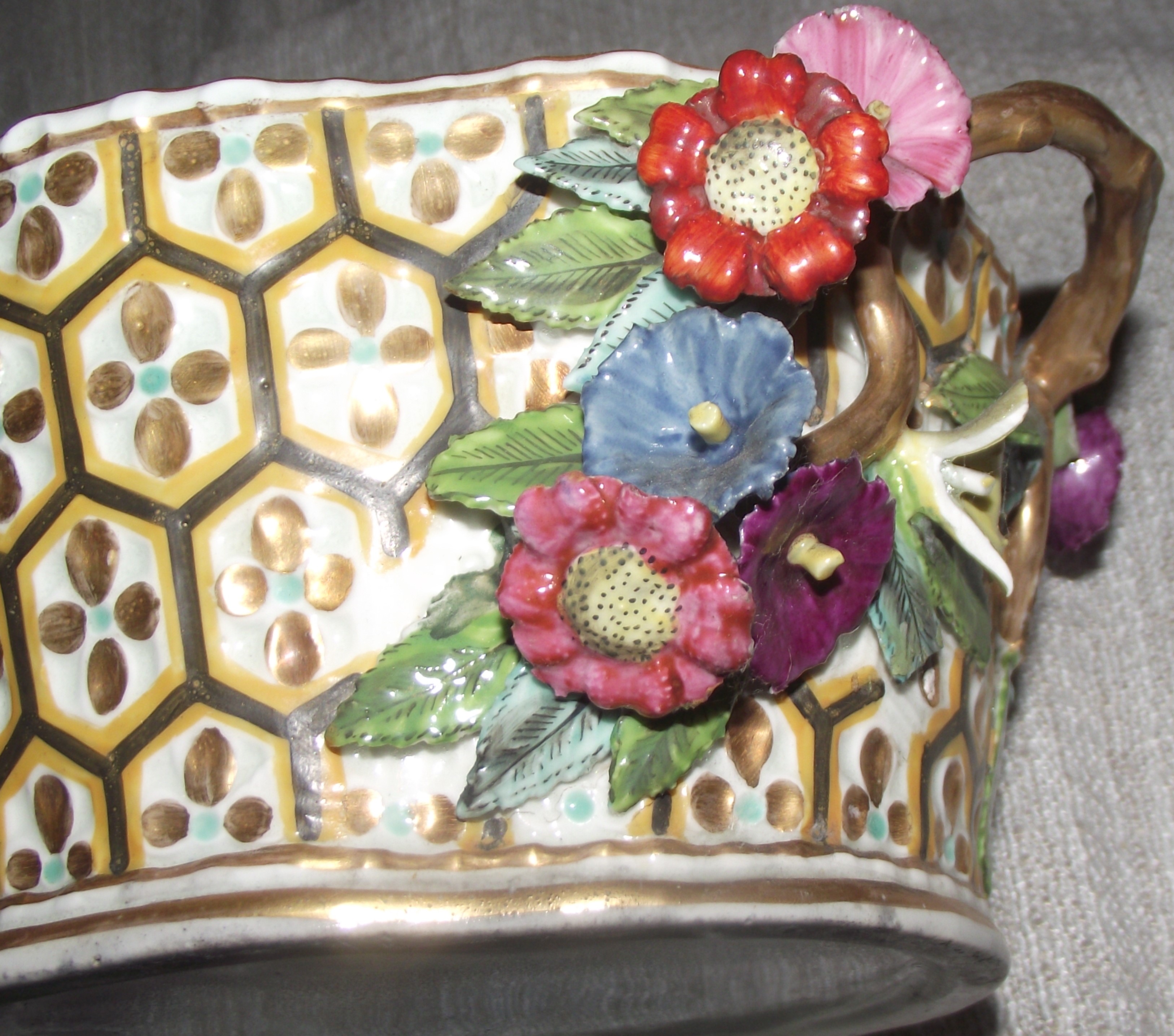 The porcelain body is structurally sound without visible cracks. There are several small chips and losses to the petals and leaves of the applied encrusted flowers. Minor wear is present on the gilding of the rim and handles.