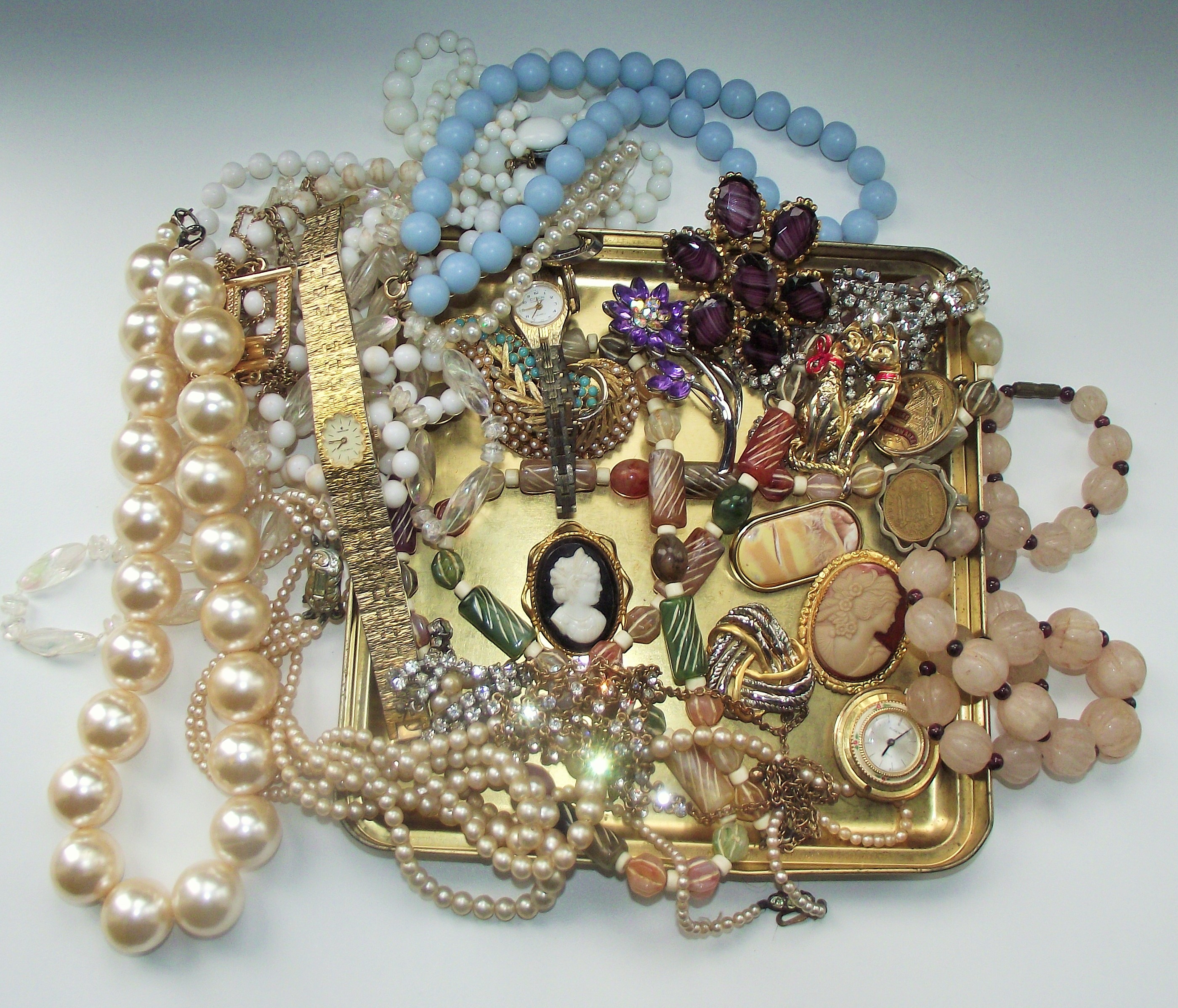 This collection of vintage costume jewelry and wristwatches includes various necklaces, brooches, and timepieces from the mid-to-late 20th century, presented on a rectangular gold-tone metal tray. Materials consist of faux pearls with coated glass or plastic cores, molded plastic and glass beads, base metal with gold-tone and silver-tone finishes, enamel, and various colorless and colored rhinestones. The lot features a strand of large graduated faux pearls, a multi-strand petite faux pearl necklace, light blue and white plastic bead necklaces, and a strand of pink-toned beads with dark spacers. One gold-tone mesh-band wristwatch is present, featuring the mark GRUEN on the dial. A second circular watch face is included as a pendant. Brooches and pins include a floral-motif piece set with faceted purple glass stones, a purple enamel flower pin with a central rhinestone, a gold-tone figural cat brooch with red accents, and a silver-tone spray brooch set with colorless rhinestones. Two cameo-style pieces are included: a black-and-white portrait cameo and a shell-style cameo in a gold-tone filigree frame. The collection also contains various gold-tone medallions and multi-colored bead strands of varied shapes.