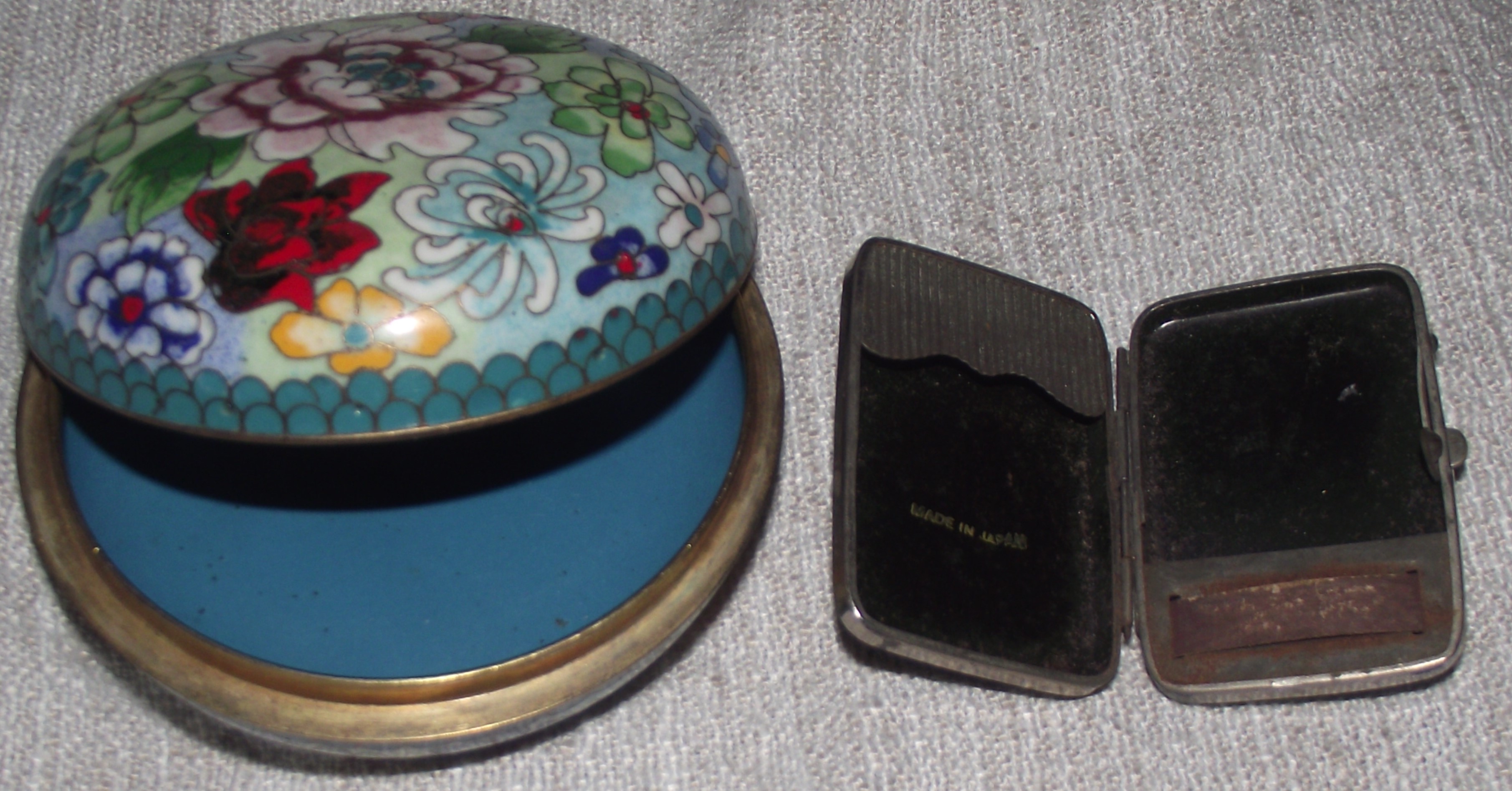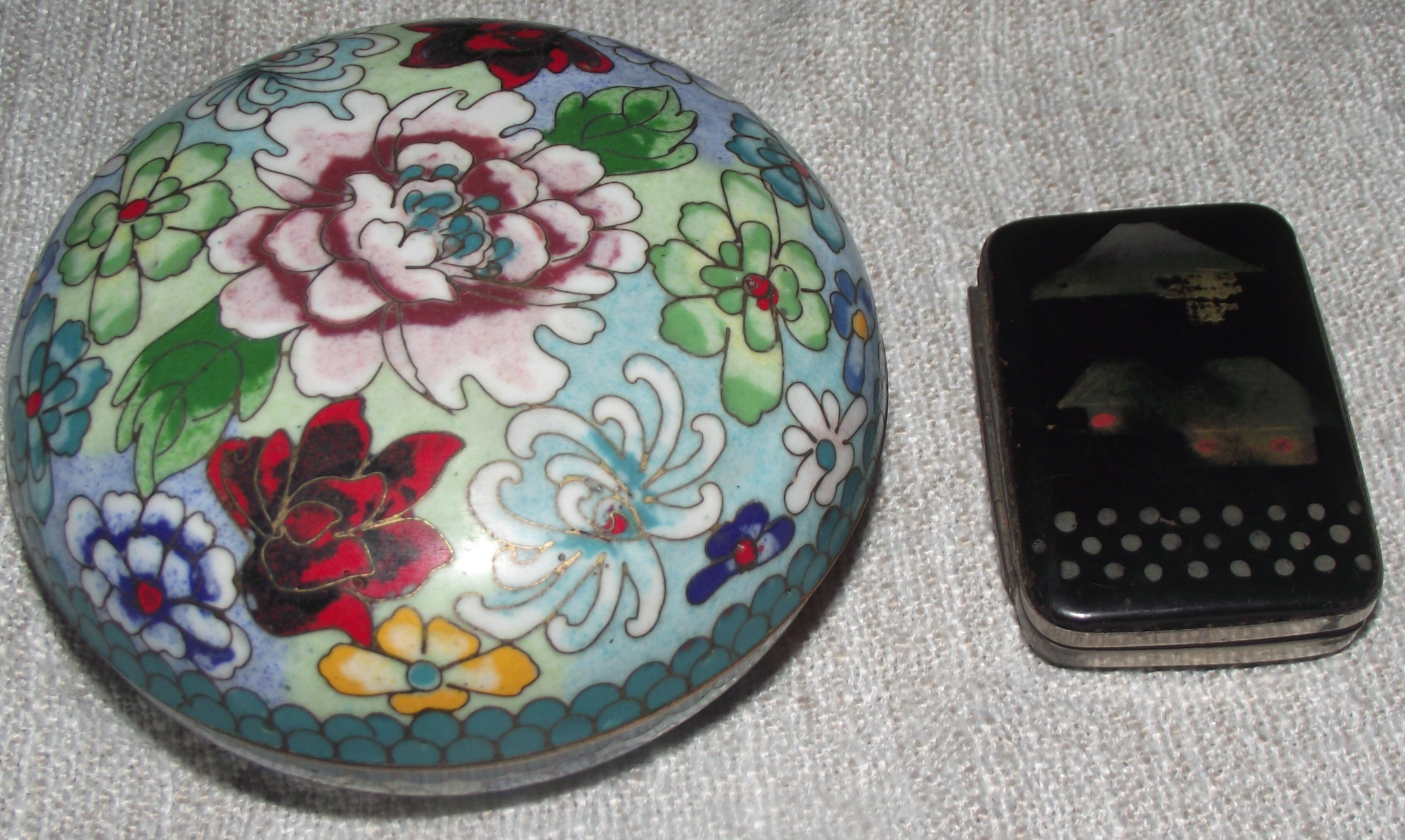Chinese Cloisonné enamel lidded bowl + Vintage Japanese match holder & striker with lacquered stylized view of mount fuji