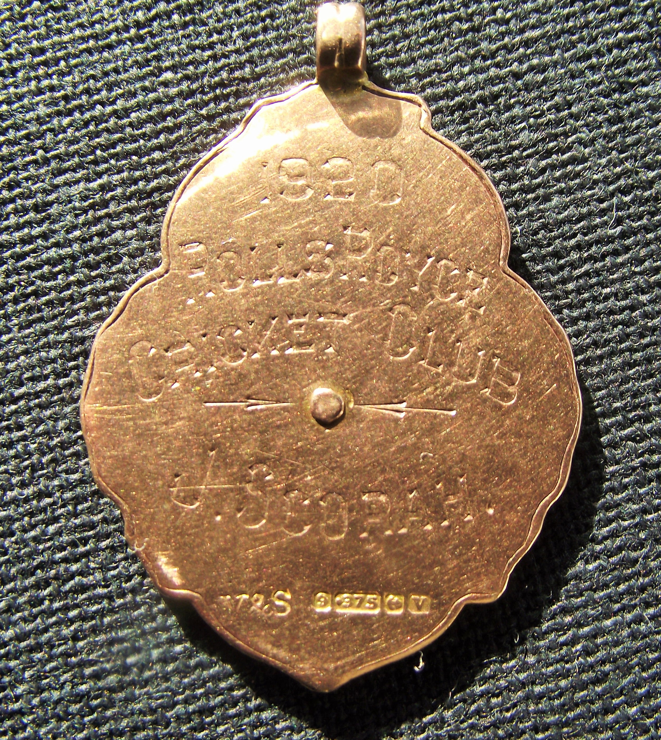 9ct gold Derby and District league 1920 Rolls Royce cricket club medal awarded J Scorah 8g approx