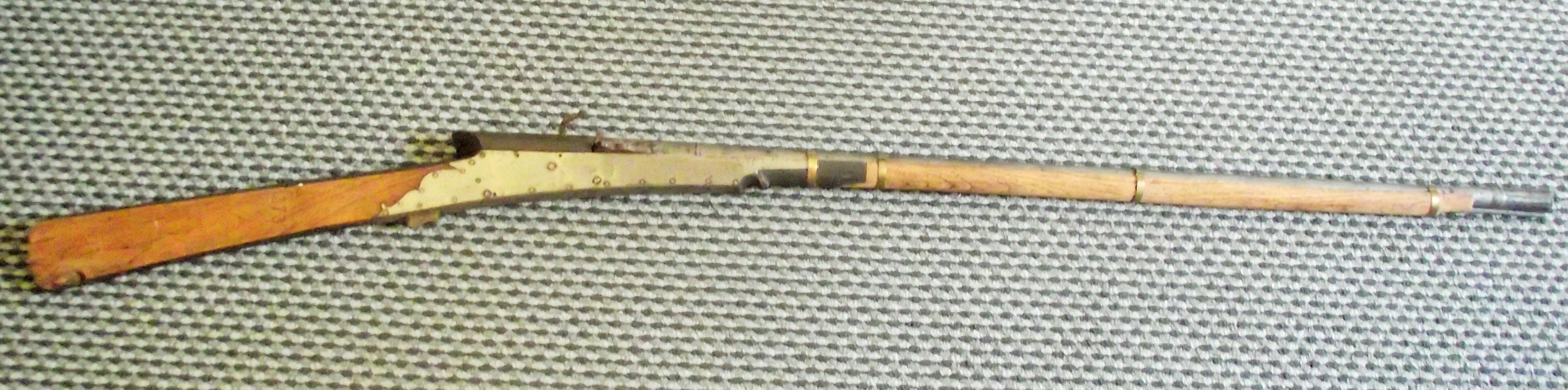 .Antique Indian Torador Mugal empire matchlock musket with riveted firing mechanism. Light wooden stock.58″ in length number on stock 373 with ram rod