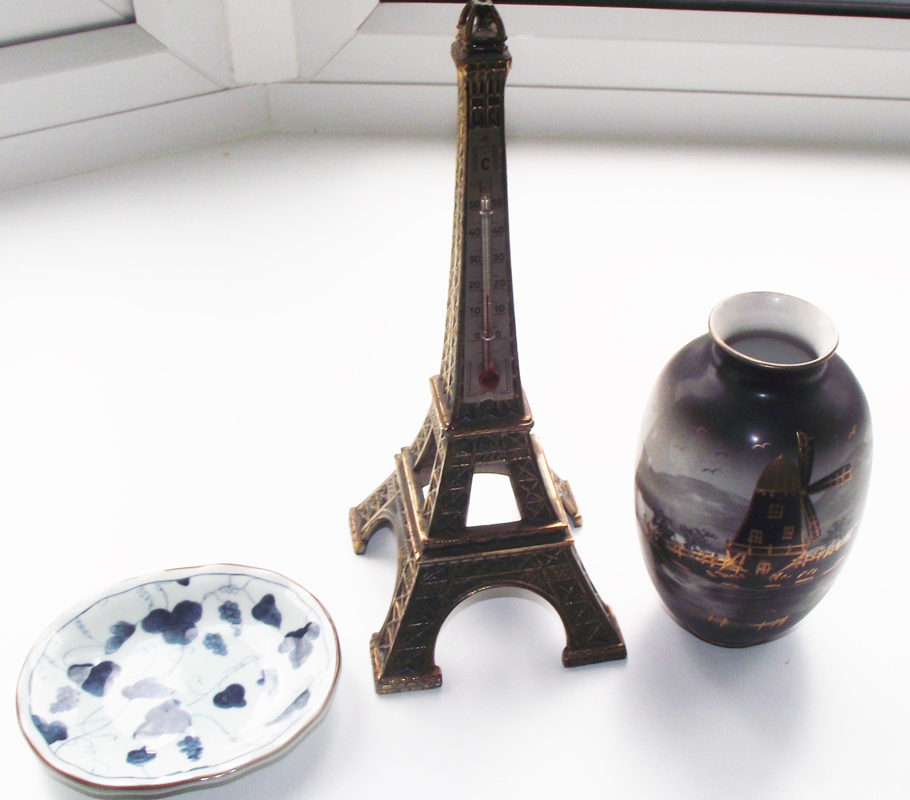 Vintage 1950/60s brass Eiffel tower thermometer + Small oriental blue/ white dish flowering grape vines signed underside + hand painted oriental style vase decorated with windmill and boats