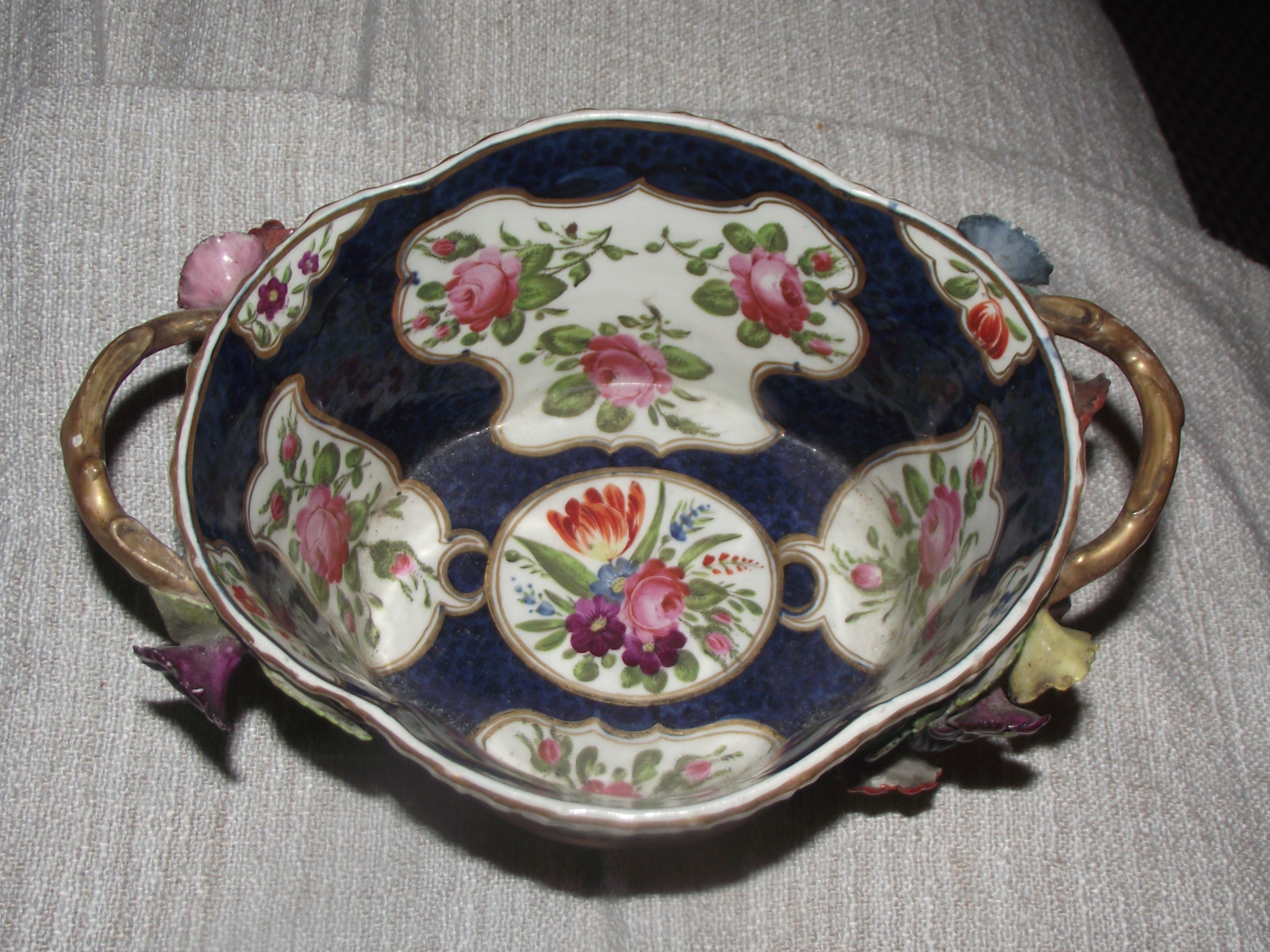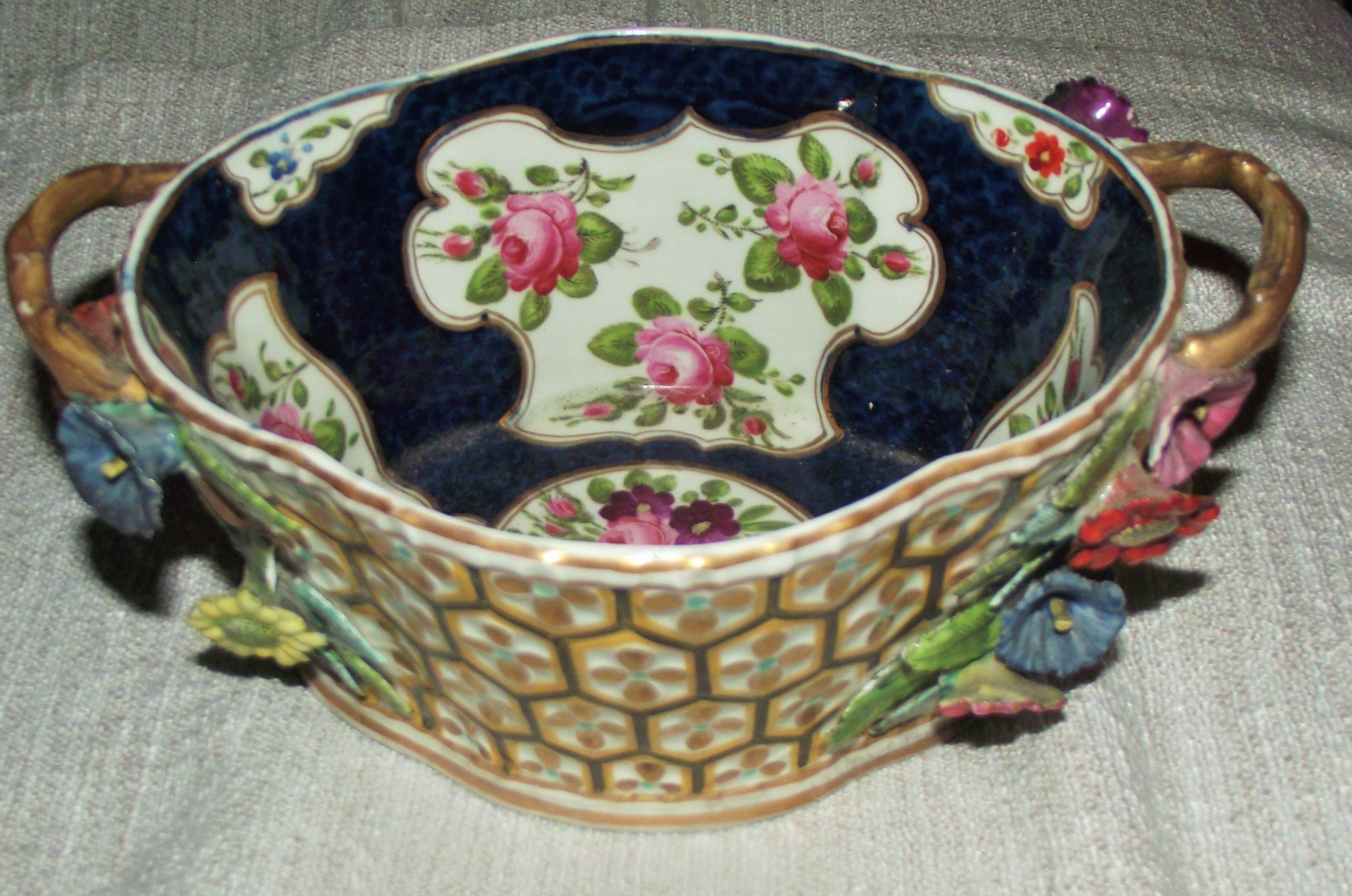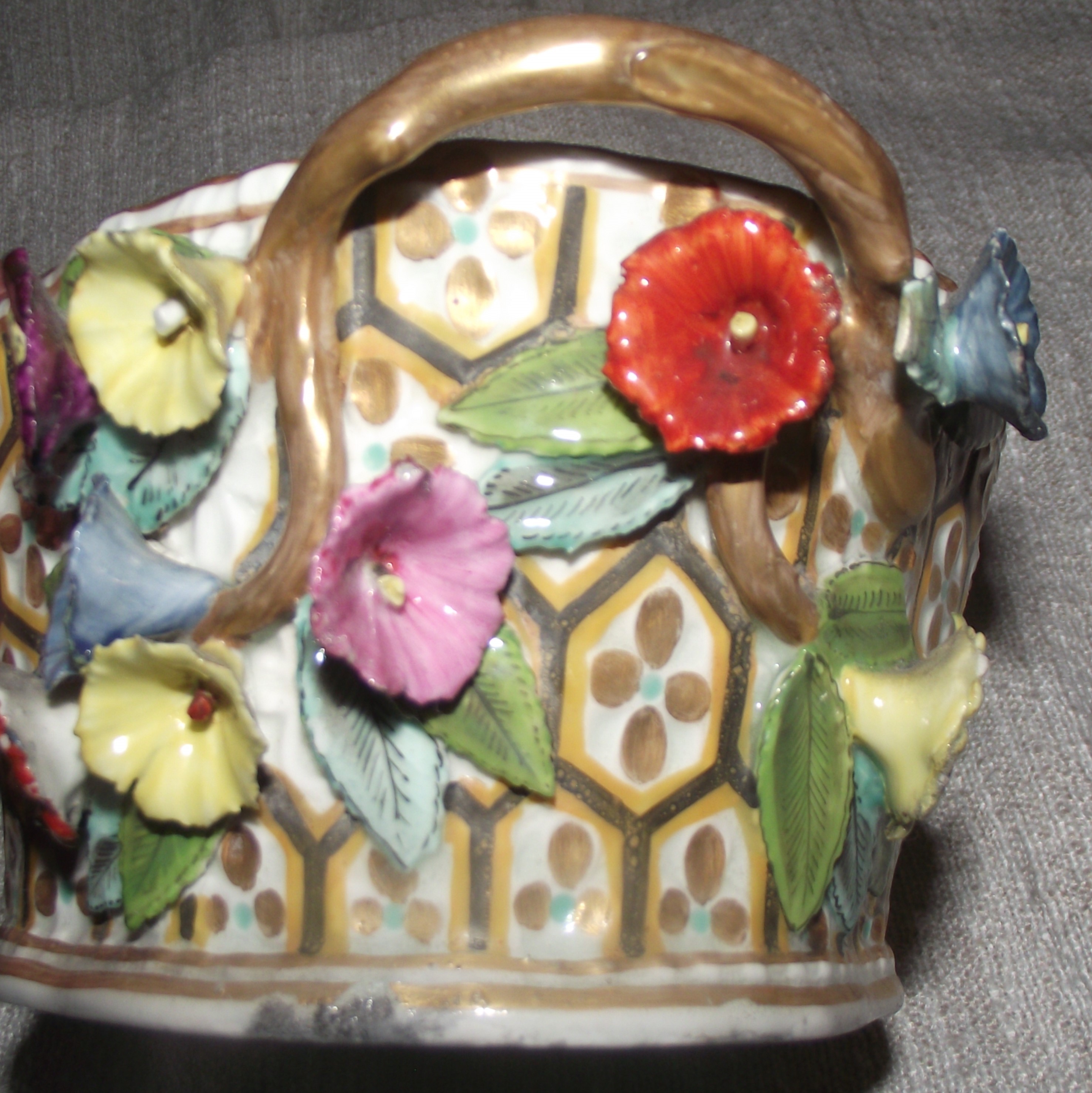 The porcelain body is structurally sound without visible cracks. There are several small chips and losses to the petals and leaves of the applied encrusted flowers. Minor wear is present on the gilding of the rim and handles.