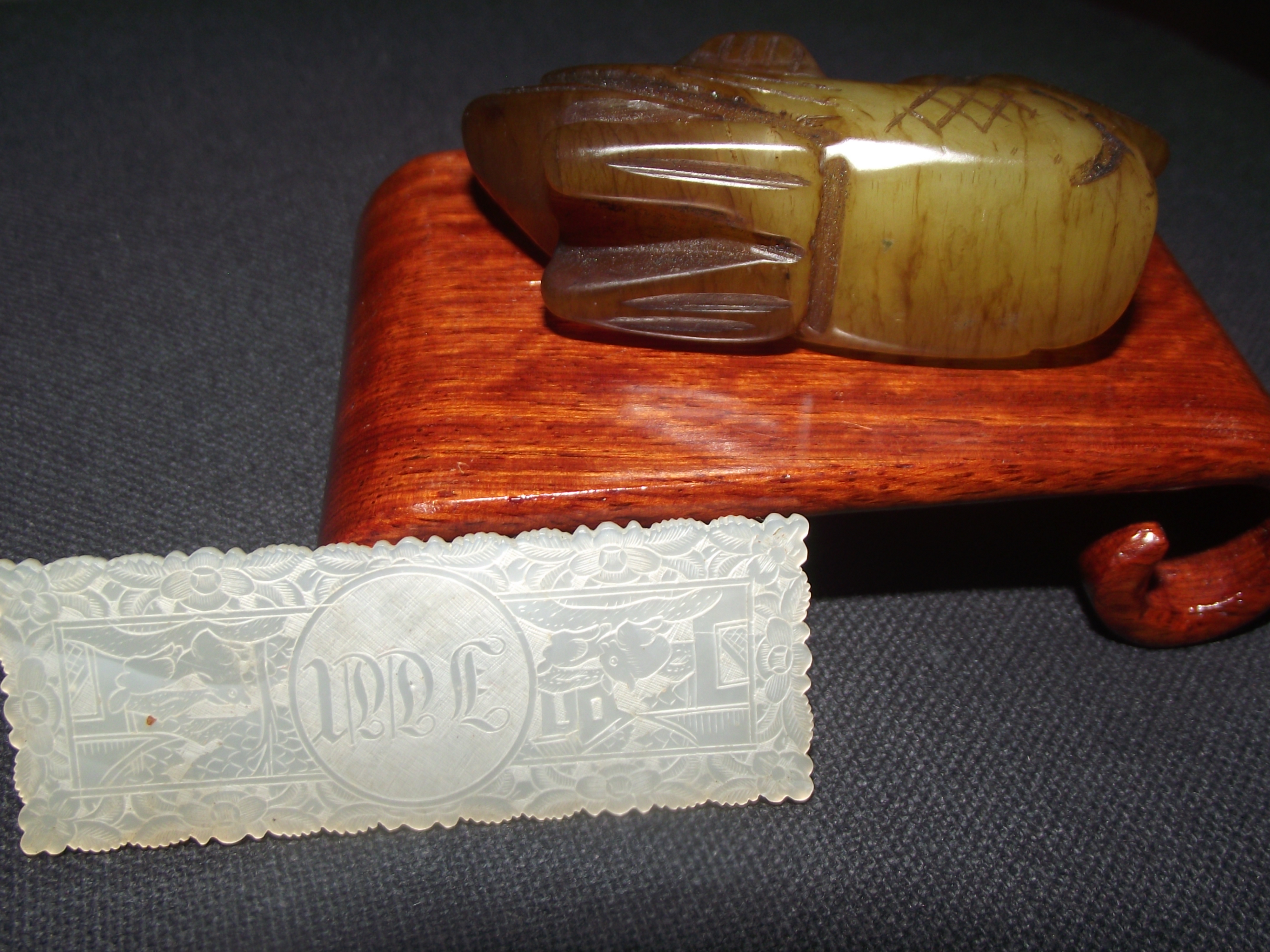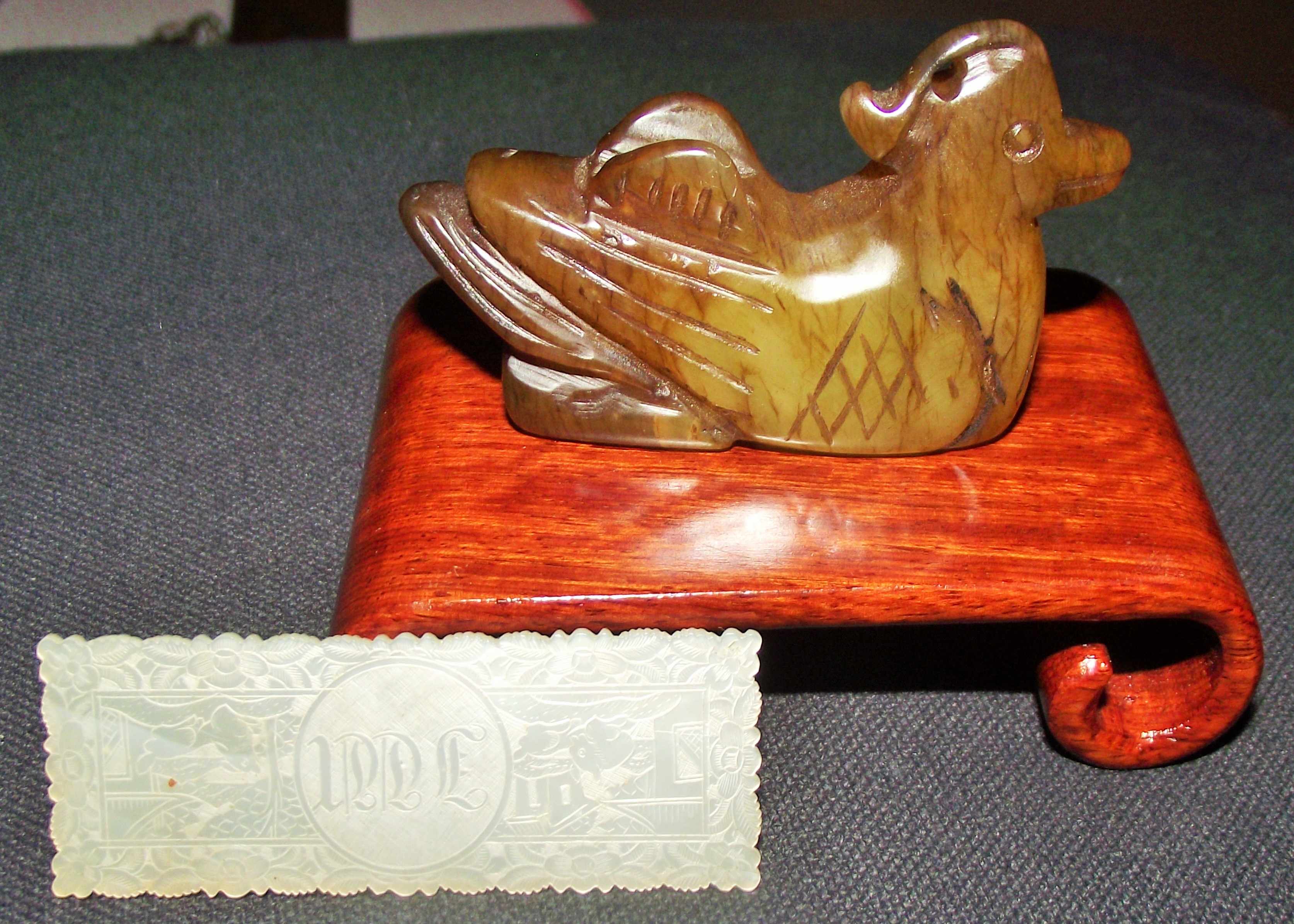 Chinese carved russet colour hard stone / Jade Mandarin duck 6×3.5cm approx on stand + Chinese mother of pearl gaming counter highly engraved on both sides 6x2cm approx