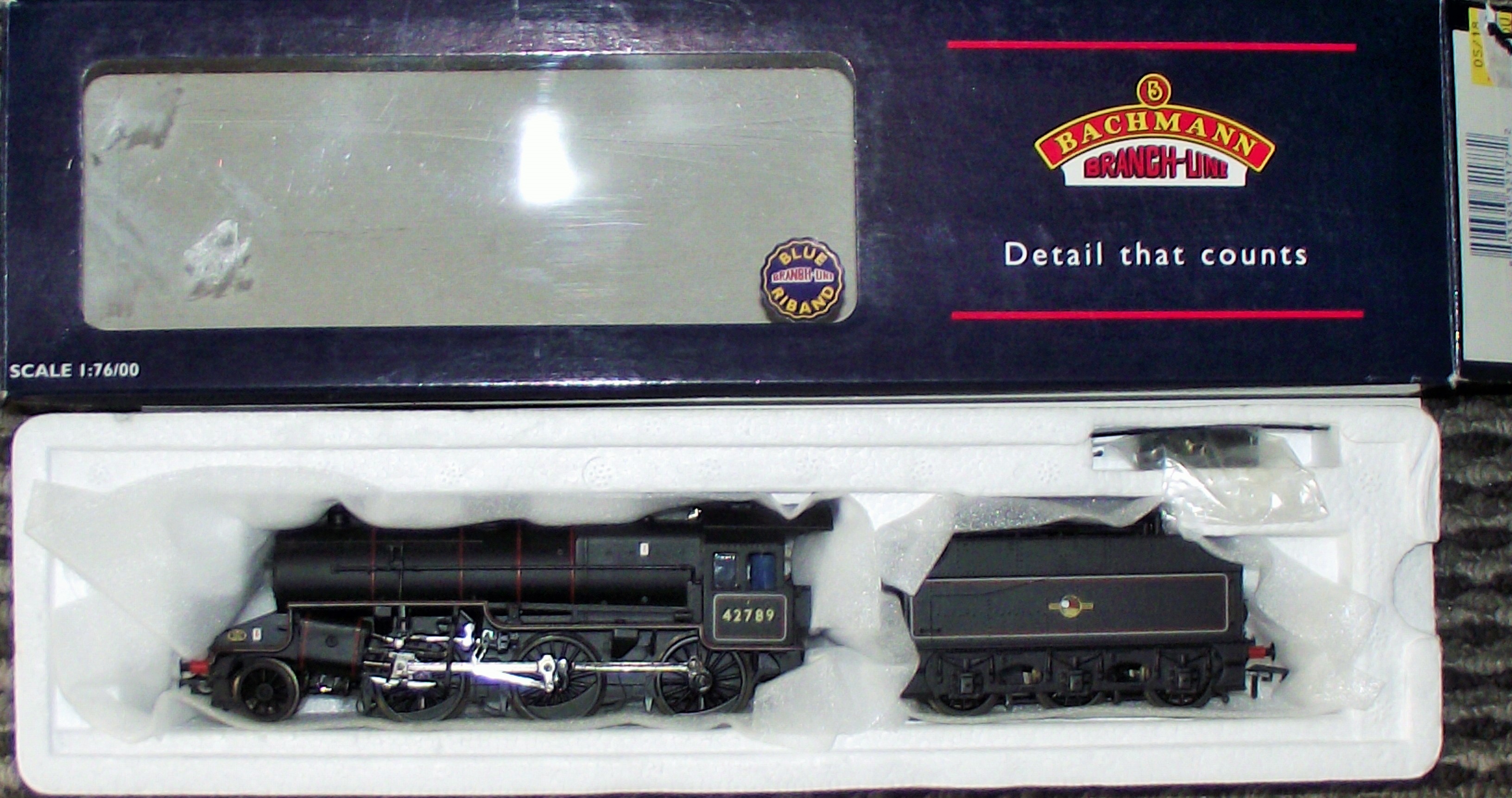 This Bachmann Branch-Line OO gauge model steam locomotive and tender represents a Hughes/Fowler Crab 2-6-0 in 1:76 scale. The model is part of the manufacturer’s Blue Riband range and is finished in a British Railways black livery with red and white lining. The cab side is printed with the road number 42789, and the tender features the early British Railways cycling lion emblem.