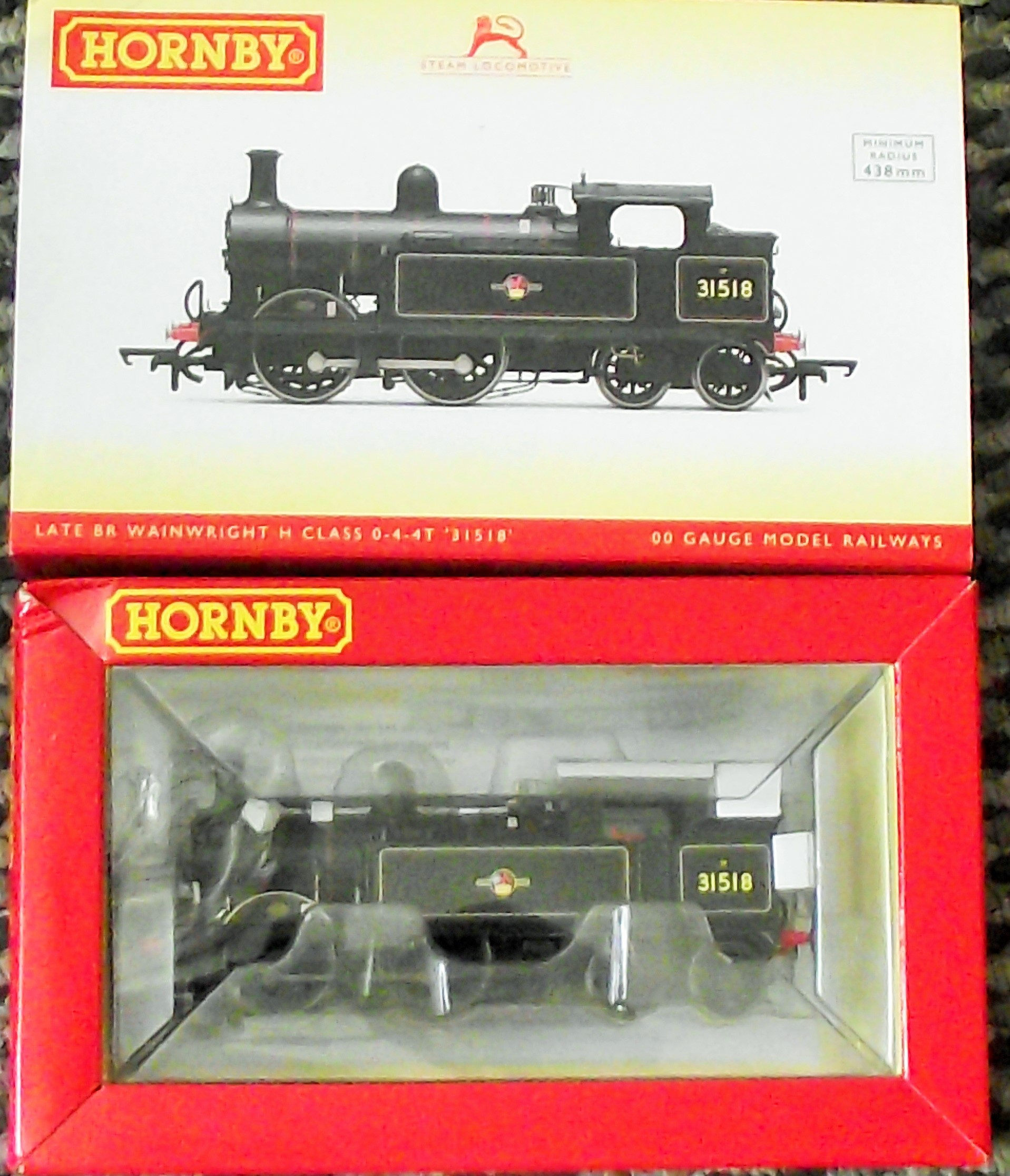 This Hornby-manufactured OO gauge model represents a Wainwright H Class 0-4-4T steam locomotive. The model is finished in British Railways (BR) late black livery and features the running number 31518 printed on the tank sides. The locomotive body displays the British Railways late crest, depicting a lion holding a wheel. Construction consists of die-cast metal and plastic components.