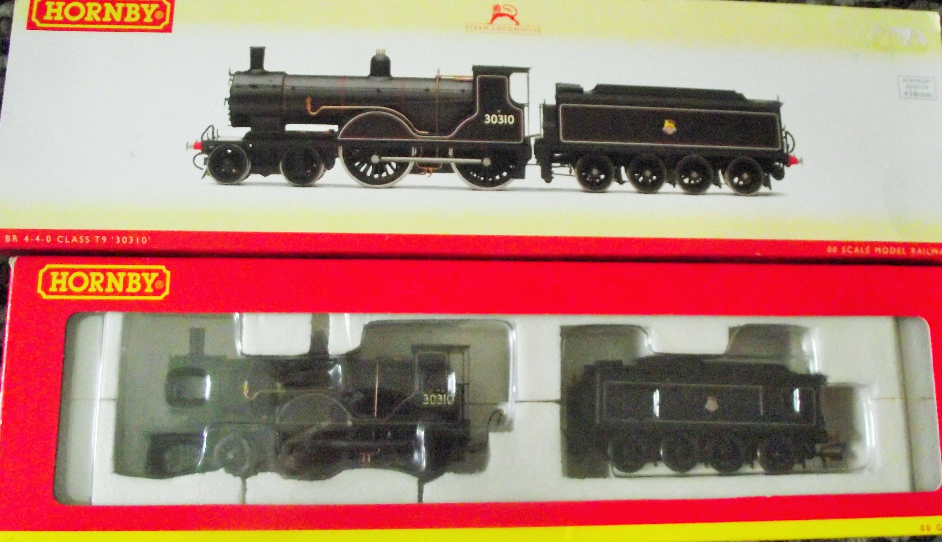 Hornby OO scale model of a British Railways Class T9 steam locomotive and tender. The locomotive features a 4-4-0 wheel arrangement and is constructed from plastic with die-cast metal wheels and chassis. The model is finished in a black British Railways livery with red lining. The cab side is marked with road number 30310, and the tender features the British Railways lion and wheel emblem. This electric-powered model is designed for use on OO scale track. The item includes its original Hornby window box and decorative outer sleeve.
