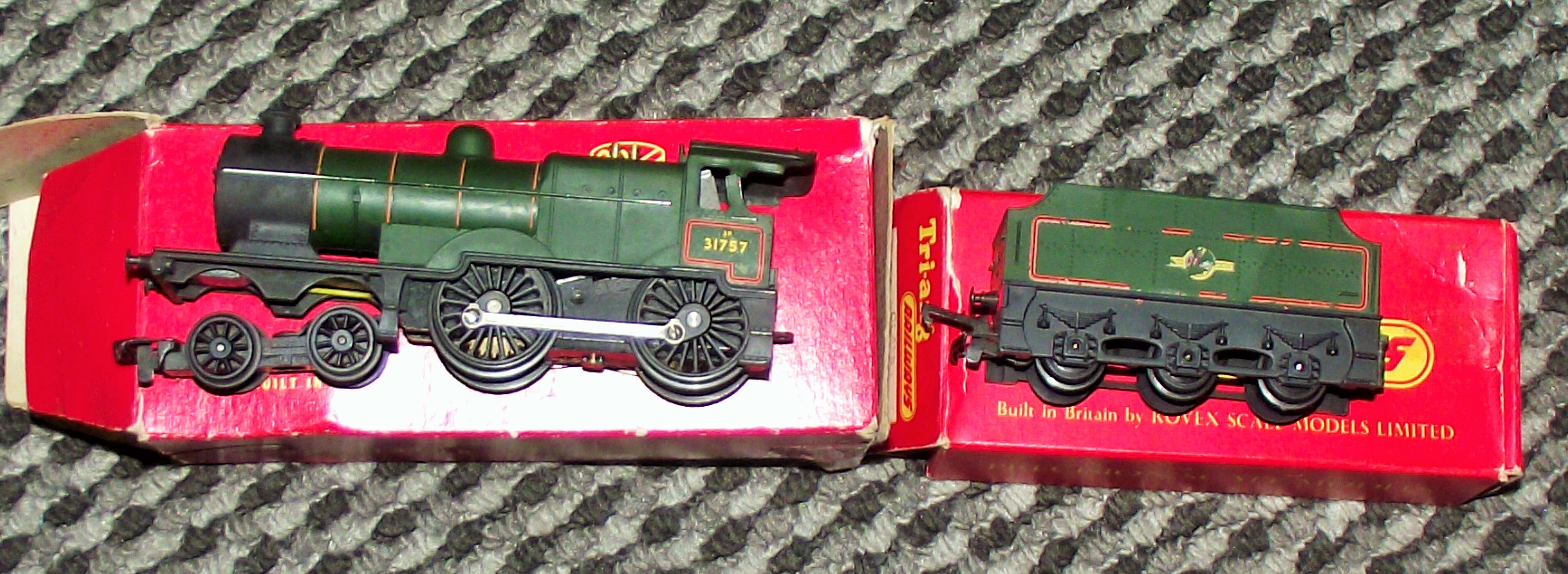 This OO gauge model train set features a Maunsell L1 Class 4-4-0 steam locomotive and its matching tender, manufactured in Great Britain by Tri-ang Railways (Rovex Scale Models Limited). The locomotive is finished in British Railways green livery with orange lining and bears the running number 31757 on the cab sides. The tender displays the British Railways early crest depicting a lion holding a wheel. The models are constructed with molded plastic bodies, die-cast metal chassis components, and metal wheels and connecting rods. The set is housed in two original red cardboard boxes. The packaging includes the Tri-ang Railways logo in a yellow oval and the text Built in Britain by ROVEX SCALE MODELS LIMITED.