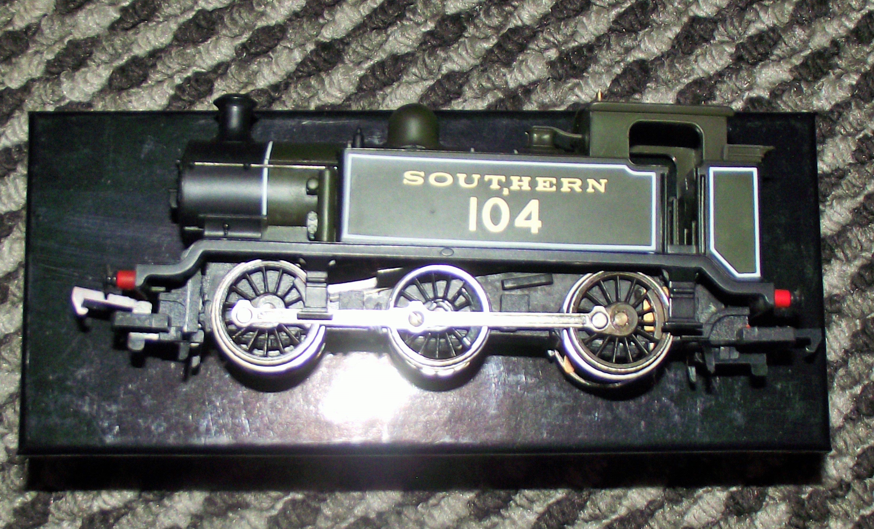 This model is a Hornby R261 Class E2 0-6-0 tank locomotive, modeled after the Southern Railway prototype. The item is designed for OO gauge model railway systems. The construction features a molded plastic body shell mounted on a metal chassis with metal wheels and coupling rods. The locomotive is finished in Southern Railway olive green livery with white lining on the tanks and bunker. The side tanks are marked with the word SOUTHERN in a gold-toned serif font above the numerals 104. Additional features include a black-painted smokebox, red-painted buffer beams, and an electric motor mechanism designed for operation on powered tracks. The locomotive is presented on a black rectangular plastic display base.