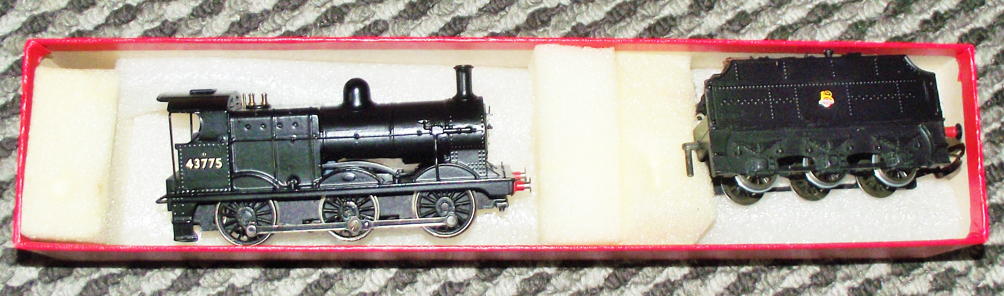 Attributed to Bachmann, this OO gauge model represents a British Railways Class 3F 0-6-0 tender locomotive. The model is finished in a black livery and features the running number 43775 on the cab sides. The accompanying six-wheel tender displays the early British Railways lion on wheel emblem, also known as the cycling lion totem. The model is constructed with molded plastic bodies for the locomotive and tender, featuring metal wheels, axles, and silver-tone metal connecting rods. Details include a molded boiler, cab, and smokebox door, along with red-painted buffers and a rear hook-and-loop coupling. The set is presented in a generic aftermarket red cardboard box with a white foam-lined interior.