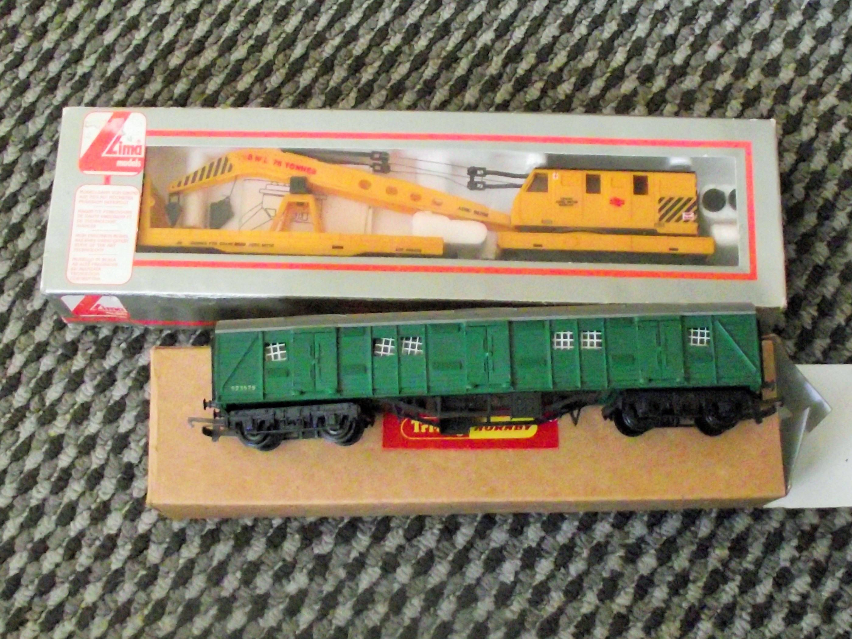 Both items appear complete and are in good vintage condition. The Lima crane box exhibits light shelf wear and creasing to the cardboard. The Tri-ang Hornby van and its original box show typical signs of age-related wear.