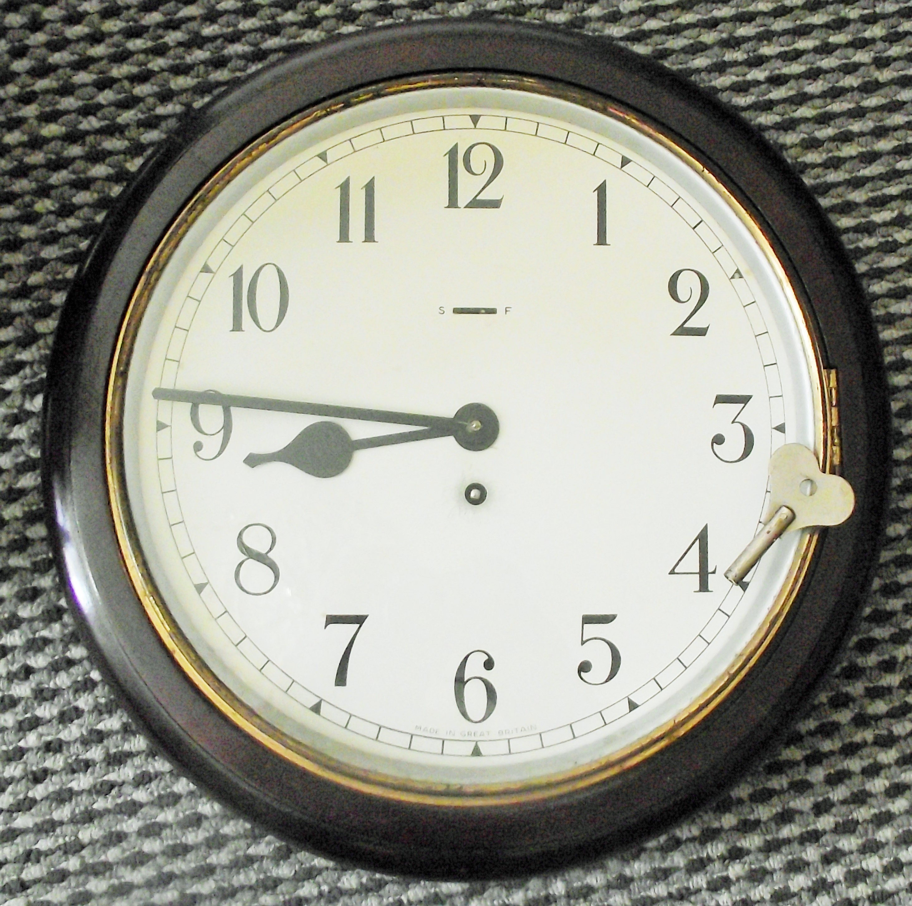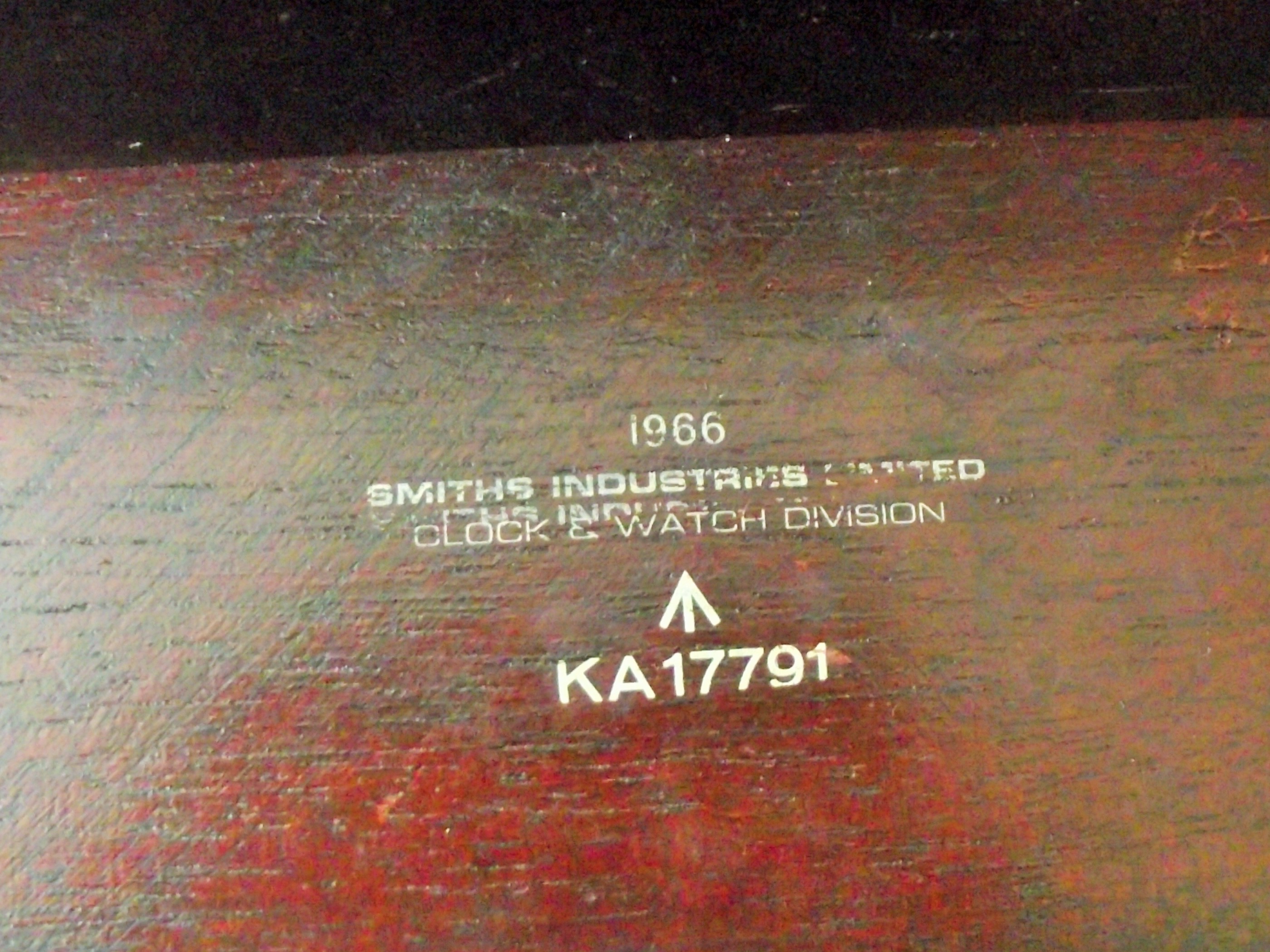 Military key wind 1966 Mahogany colour cased wall clock, made by Smiths Clocks & Watches Ltd. Dial size – 12″ marked with Broad Arrow No KA17791 dated 1966 with key seen working